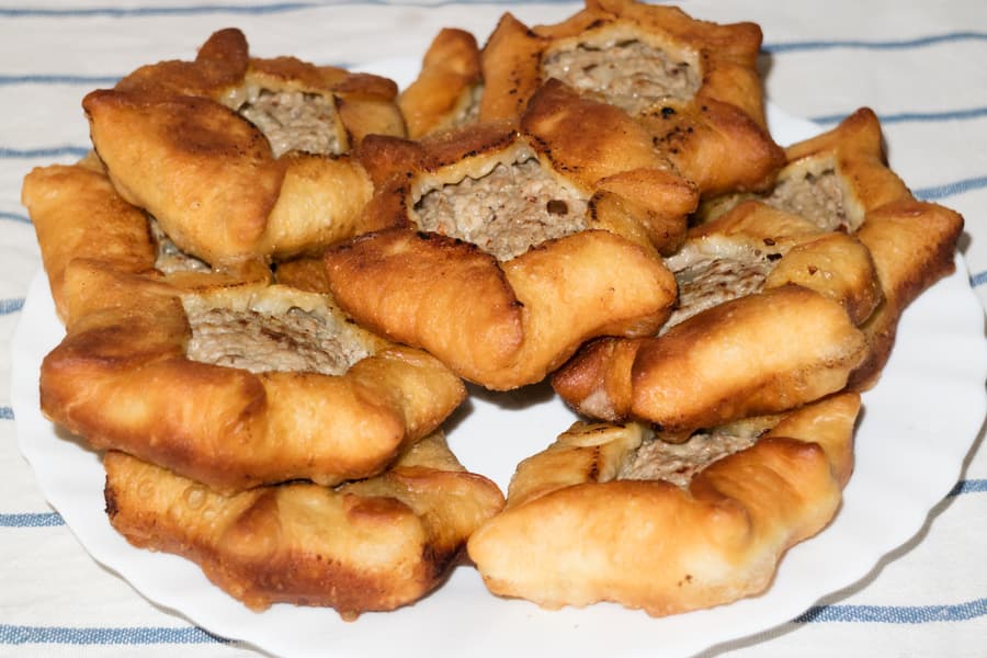 Затем смешали свиной и говяжий фарш, хорошо перемешали, часть убрали в морозилку, а в оставшуюся часть добавили немного холодной воды, измельченный лук, соль, перец и прочие хмели-сунели. Хорошо отбили и убрали в холодильник. Пока в тепле подходило дрожжевое тесто, фарш отлично выстоялся. В результате всех действий получили пару десятков сочных беляшей.