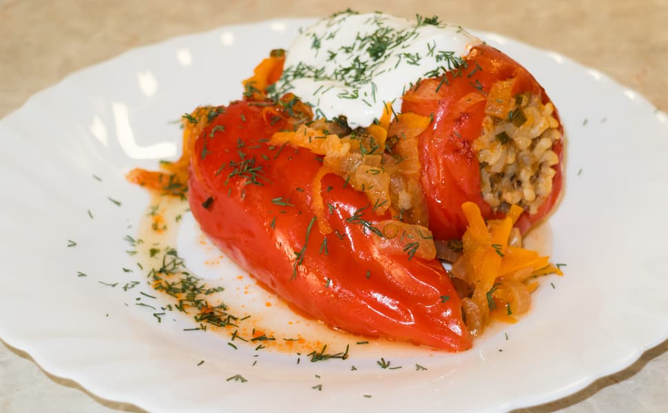 Очистили болгарские перцы, поджарили лук с морковью, добавили томатную пасту — тем самым подготовили соус, в котором потушили фаршированные перцы.