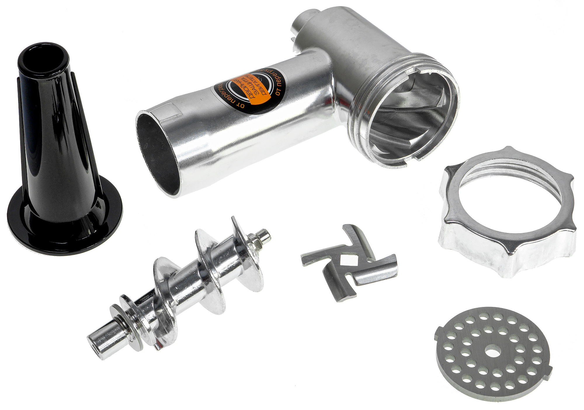 - блок мясорубки в сборке (корпус, шнек, нож, решетка со средними отверстиями, фиксирующее кольцо);