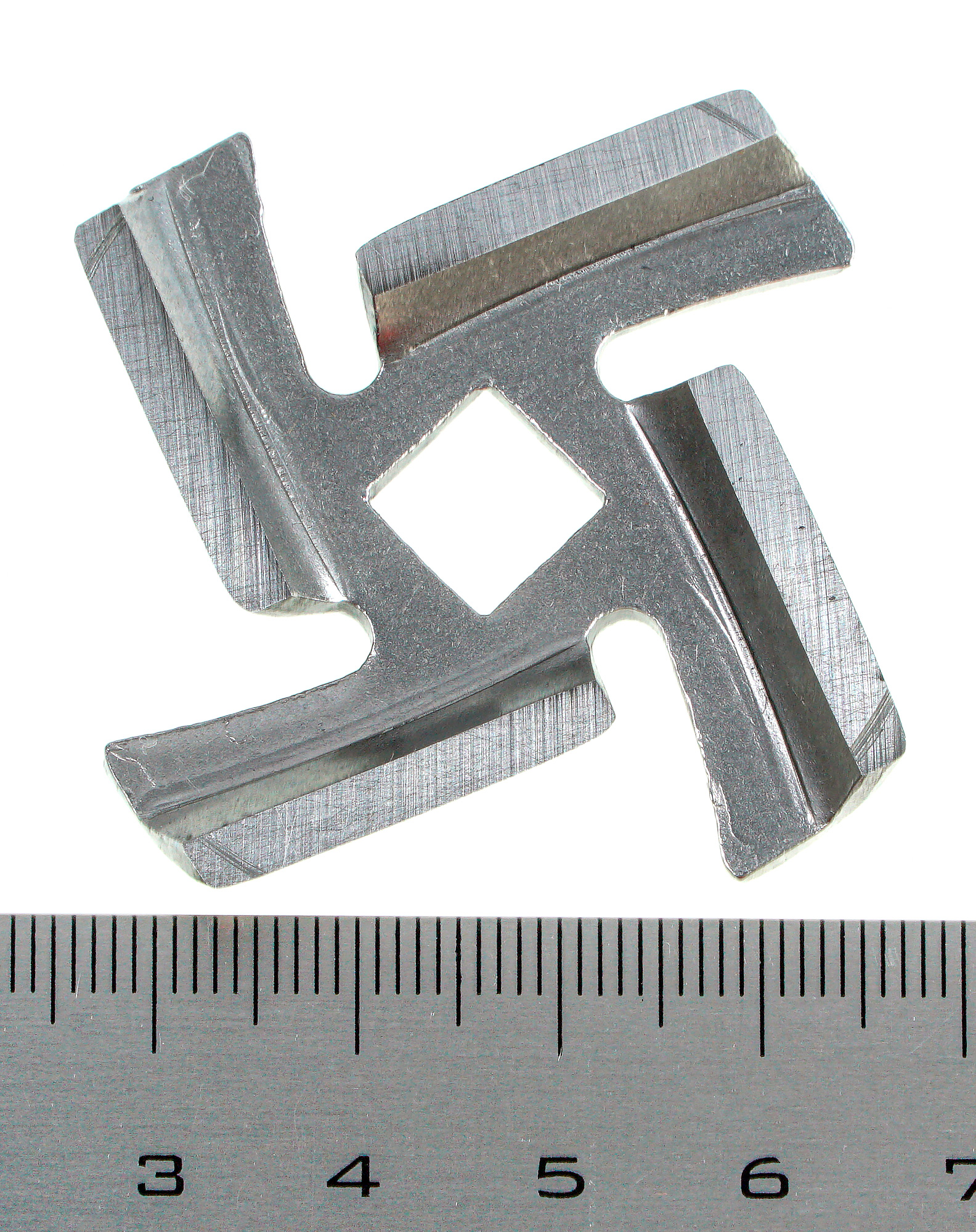 Насадка мясорубки изготовлена из силумина. Нож и формовочный диск — из нержавеющей стали. Детали обработаны качественно, поверхности гладкие, без зазубрин и следов облоя. Конструкция и форма деталей абсолютно стандартные. Обратим внимание лишь на то, что размеры корпуса не слишком велики — пальцы достают до задней стенки корпуса, что поможет легко и качественно вымыть его после работы.