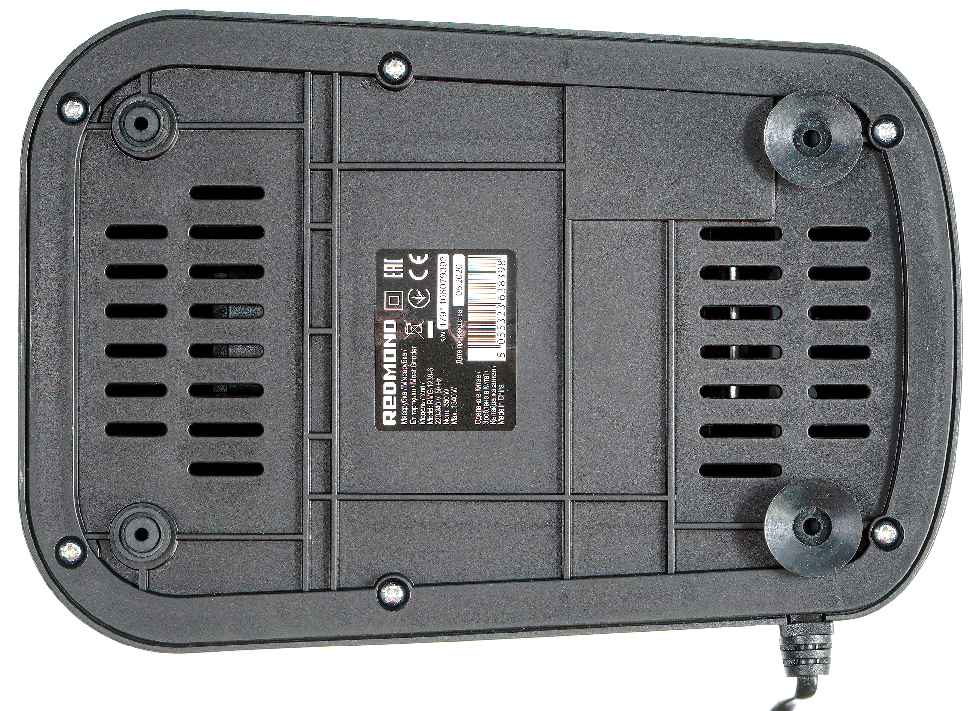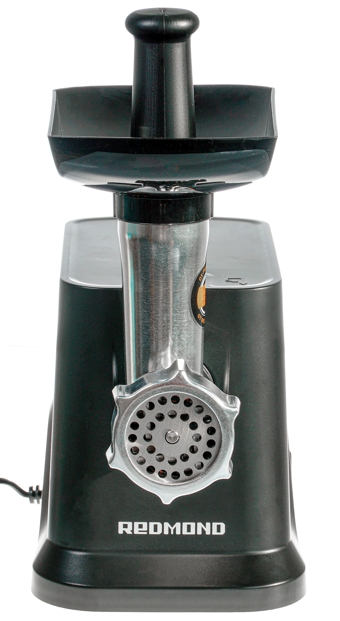 Шнур электропитания выходит из нижней стороны задней панели. Длина его невелика, что является стандартной ситуацией для мясорубок. Отсеком для хранения или сматывания шнура прибор не оснащен.