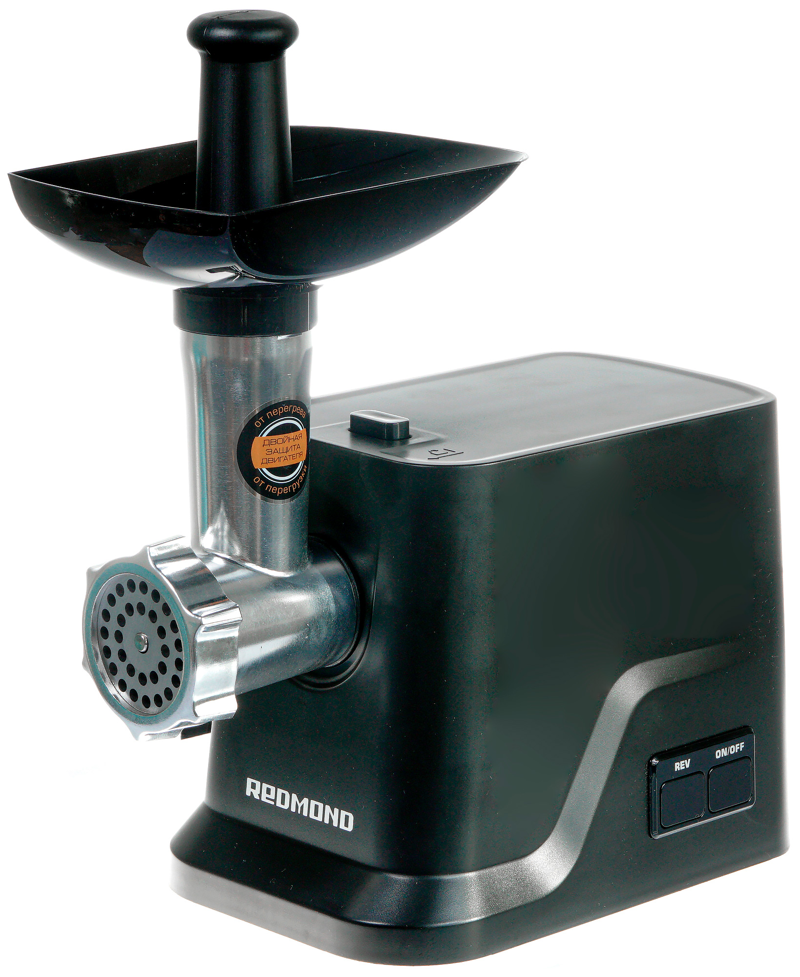 Мясорубка Redmond RMG-1239-6 выглядит вполне привычно: черный корпус устойчивой формы, две кнопки управления на передней панели и кнопка блокировки насадок сверху, место крепления насадок — с левой боковой стороны. Основное впечатление — моторный блок очень легкий — его вес составляет всего полтора килограмма.