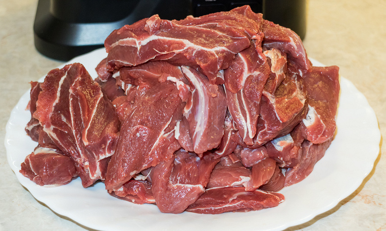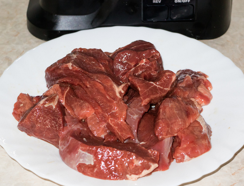 В этот раз мы решили приблизить наши испытания к максимально реалистичной ситуации — не стали мыть насадку после теста со свининой. Поэтому по завершении работы и фотографирования ножа и шнека, мы установили детали на место, закрутили кольцо и приступили к следующему эксперименту. Для него мы взяли 730 г говядины — шейную часть без большого количества жил и пленок.
