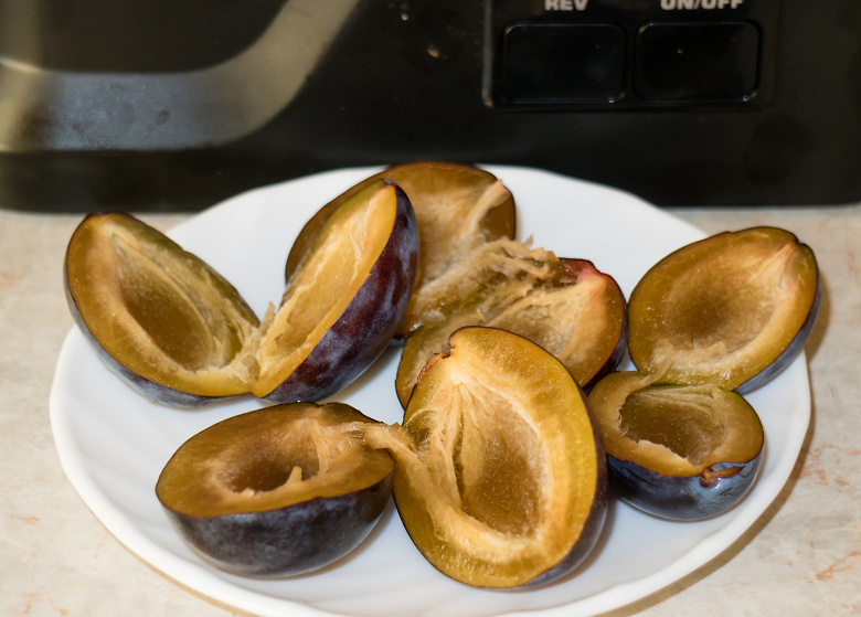 Прочитав в инструкции, что терку можно использовать для приготовления фруктовых пюре, попробовали натереть мягкую сливу-венгерку. Удалили косточки и приступили.
