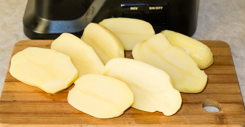 Второй тест мелкой терки было решено провести на картофеле, чтобы затем сделать драники. Четыре корнеплода средних размеров очистили и разрезали пополам. Диаметр загрузочного отверстия позволяет нарезать овощи довольно крупно.