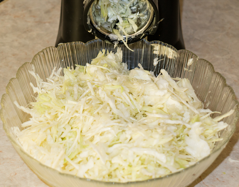 С помощью слайсера можно нашинковать капусту, но процесс этот, на наш взгляд, излишне проблематичен. Сначала нужно нарезать овощ на подходящие кусочки. Причем сделать это нужно так, чтобы срез, который окажется на цилиндре в насадке, состоял преимущественно из перпендикулярно расположенных листьев. Если кусочек чуть крупнее, то он плохо проталкивается внутрь насадки, а если листы ложатся на режущие кромки, то в результате получаются неровные округлые кусочки. Периодически нужно останавливать работу и извлекать из внутренностей барабана спрессовавшиеся кусочки. В общем, нашинковать капусту можно, и результат получается хороший, но утомителен подготовительный этап.