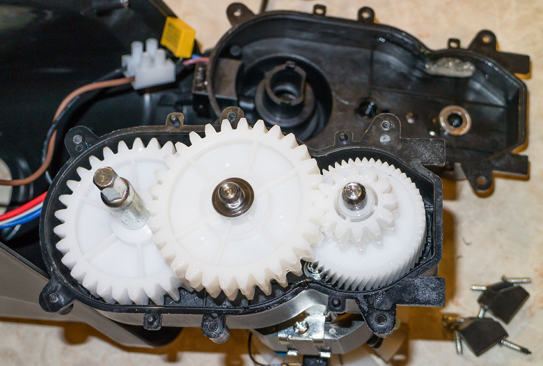 Редуктор имеет конструкцию, которую мы видели уже десятки раз, и состоит из трех пластиковых шестерней.