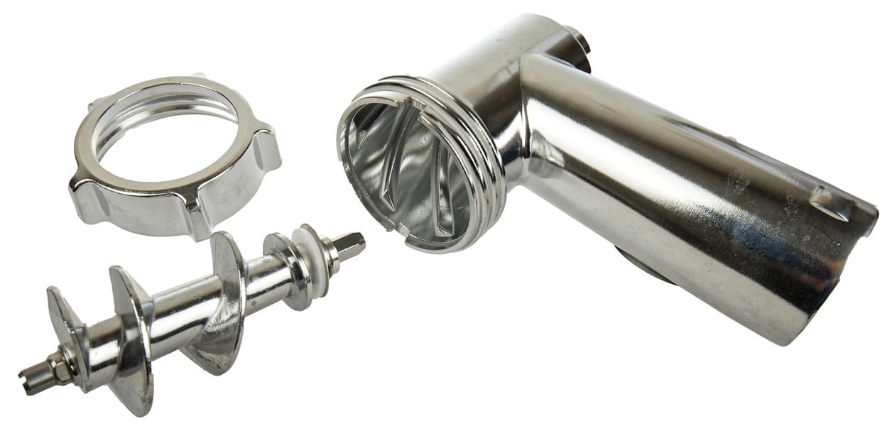 Корпус насадки-мясорубки, шнек и гайка изготовлены из легкого алюминиевого сплава — силумина. Все детали качественно обработаны, поверхности гладкие, без зазубрин и следов облоя. Длина корпуса — всего 10 см, так что губка легко отмоет все загрязнения.