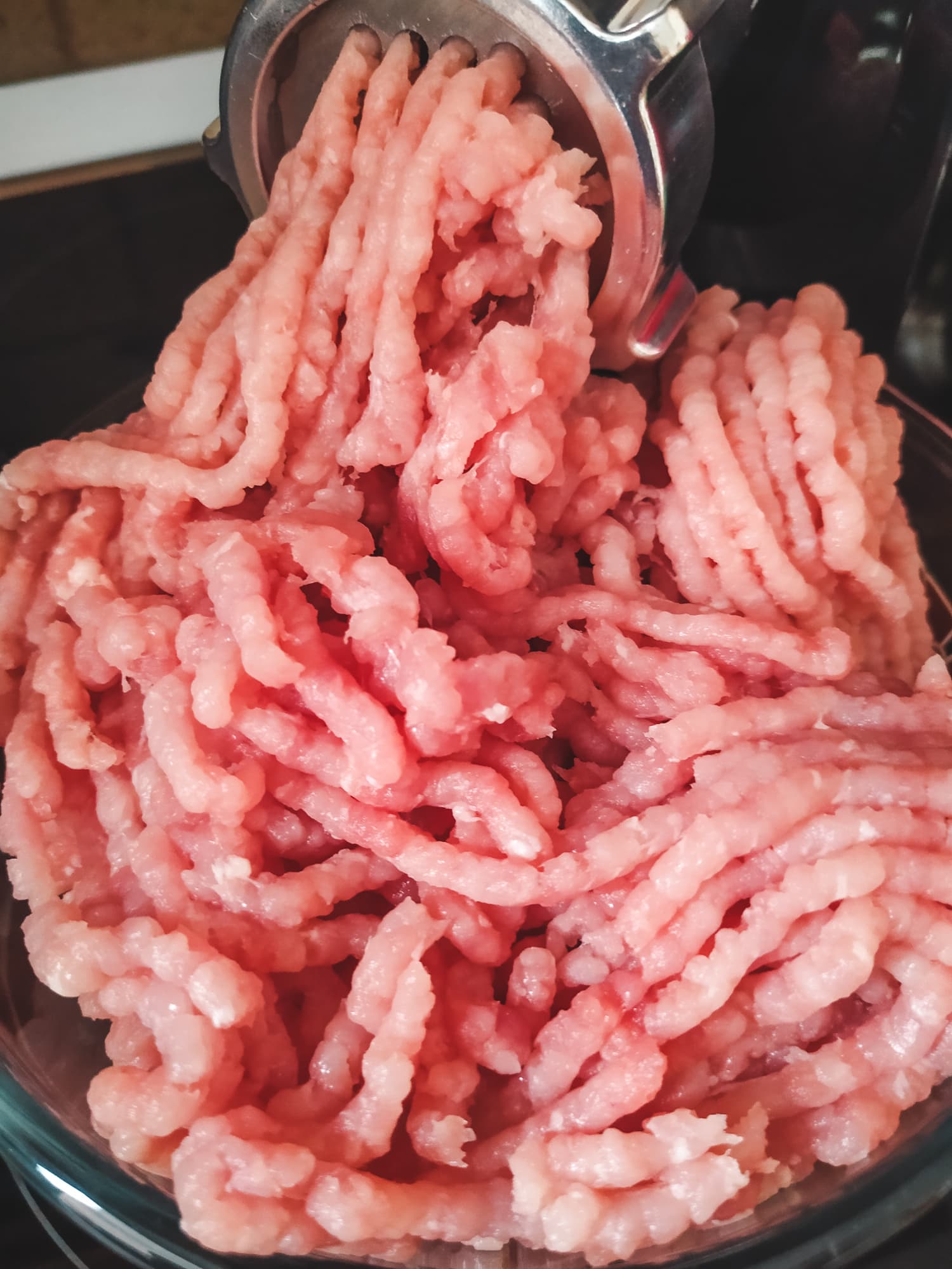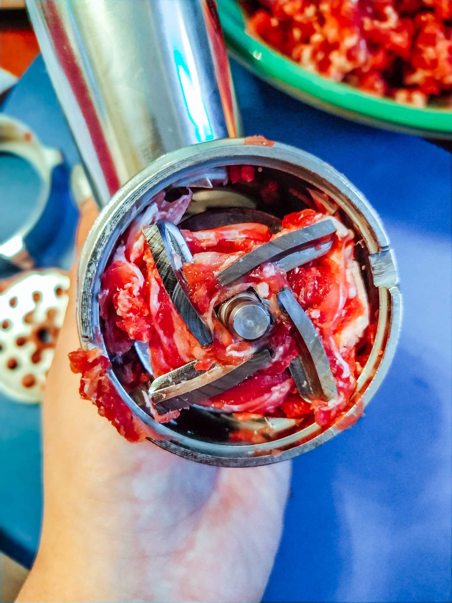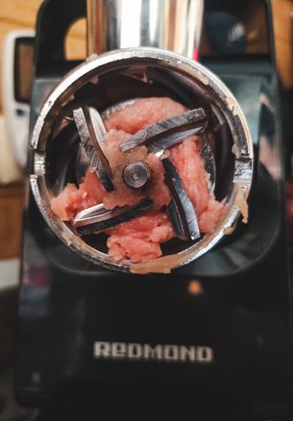 Под грохот редуктора кусочки свинины захватывались шнеком и выходили из решетки в виде ровных колбасок фарша. Никаких задержек или чрезмерного сдавливания мяса мы не заметили, оно нарублено равномерно и некрупно.