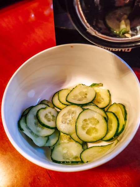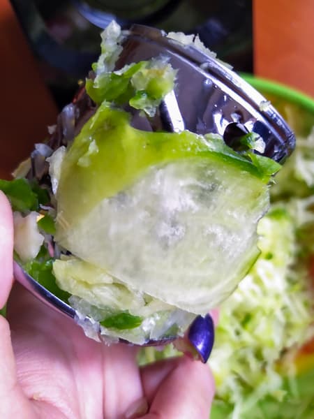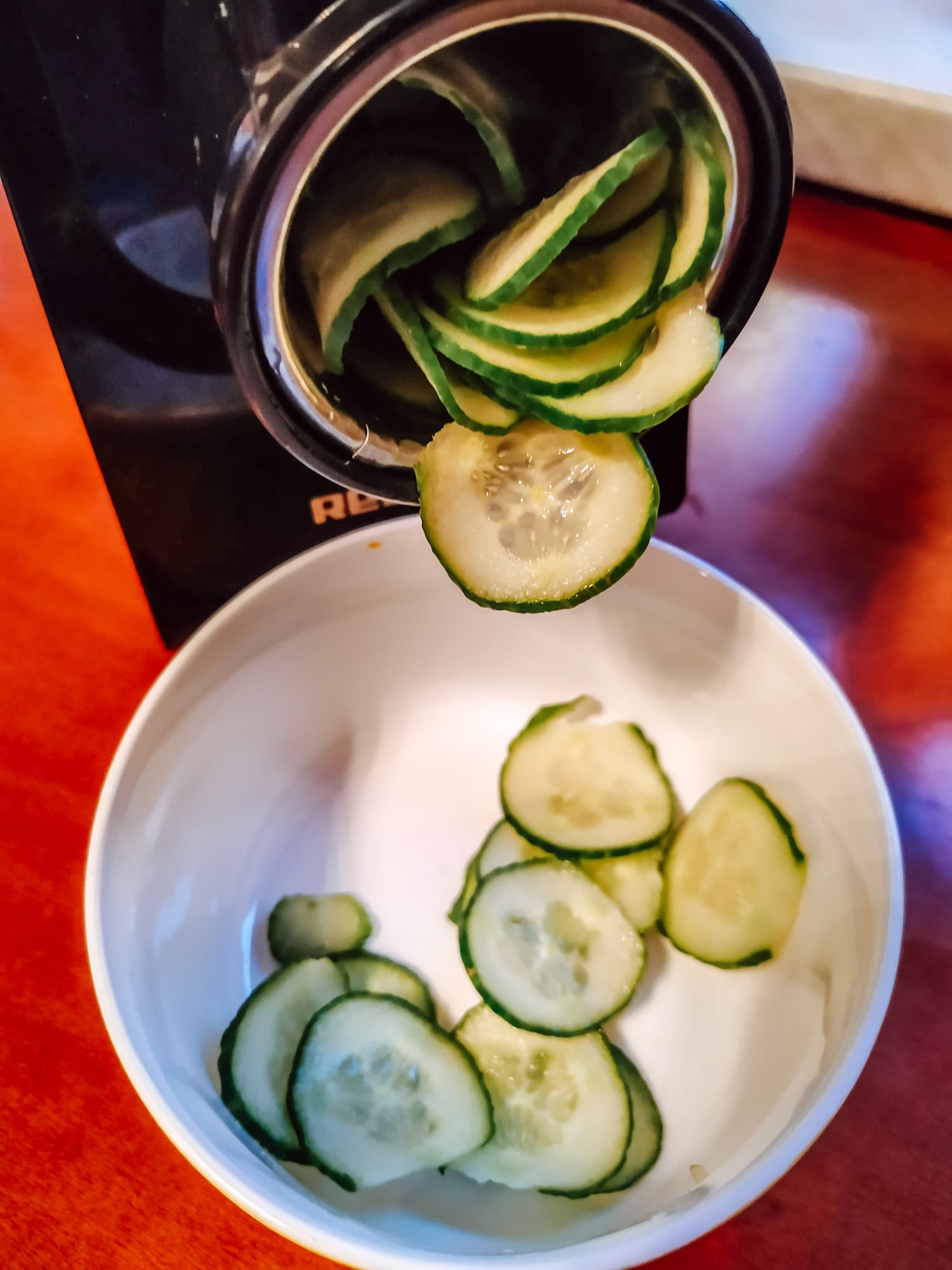 Шинкует Redmond RMG-1241-6 очень тонкими ломтиками в 1-1,5 мм. В миску упало совсем немного — опять пришлось выковыривать огуречные кружки из терки.