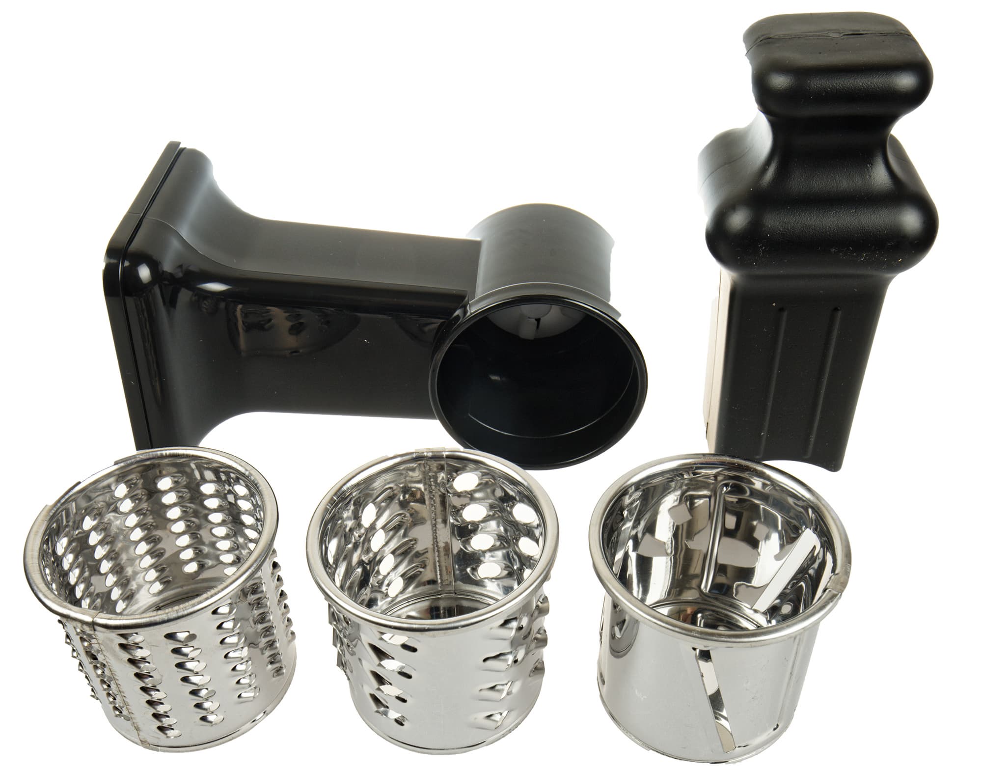 Насадка для нарезки овощей и других продуктов представляет собой отдельный корпус с толкателем и металлическим цилиндром, который, вращаясь, измельчает продукты. Размер загрузочного отверстия 5×5 см — в него легко поместится крупная морковь или четвертинка яблока. Для того чтобы зафиксировать терку внутри корпуса, следует просто совместить отверстия на дне цилиндра с выступами на валу корпуса.
