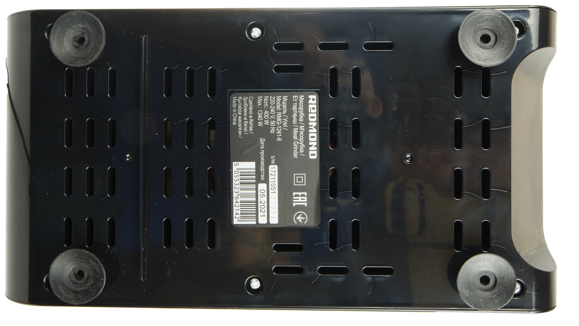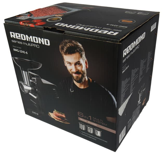 Коробка оформлена в типичном для Redmond стиле с элементами современной повестки: вместо томной красотки на нас смотрит улыбающийся бородач. Также мы видим изображение самой мясорубки и трех прилагающихся к ней насадок-терок. На боковые грани коробки вынесены технические данные прибора и описания функций насадок, информация дублируется на английском языке.