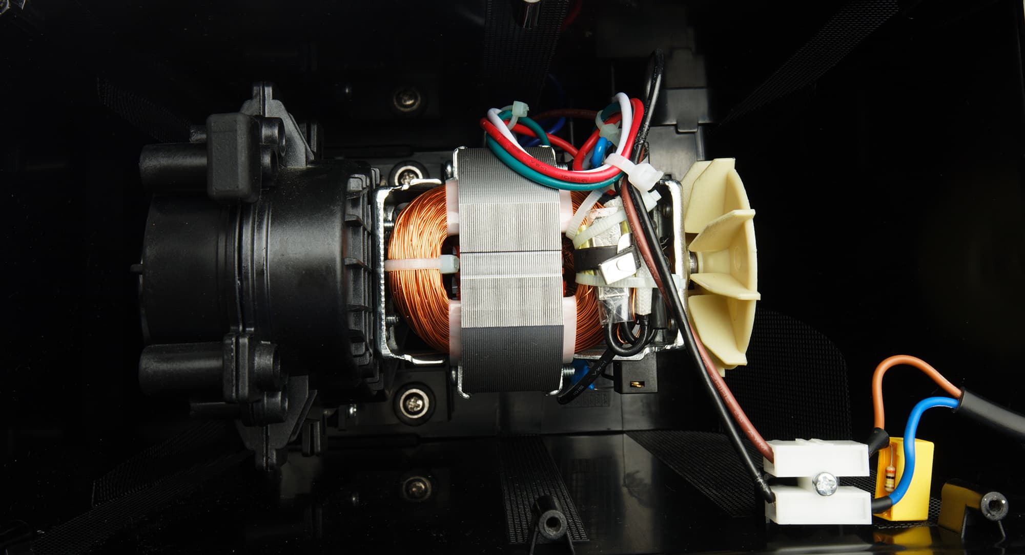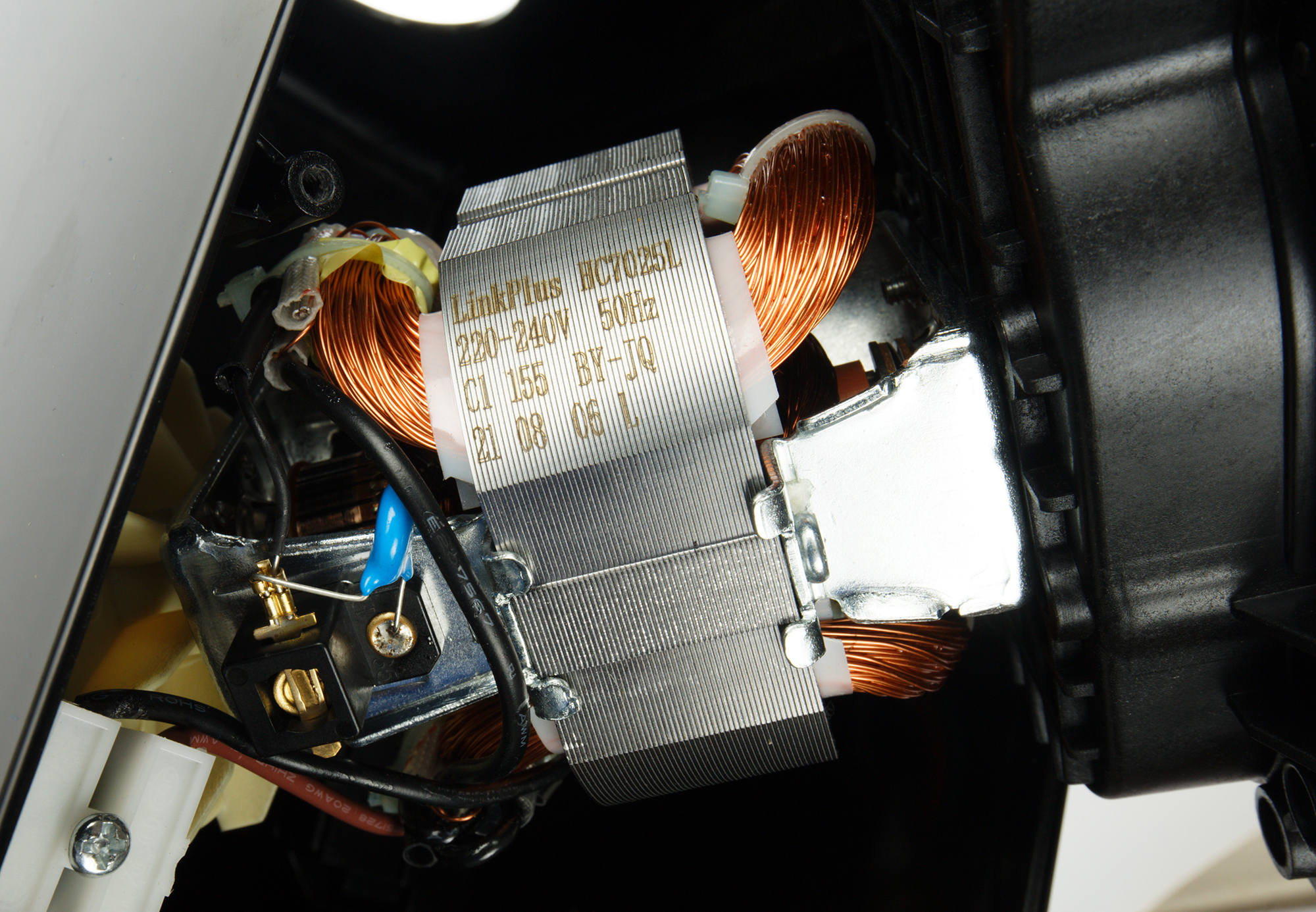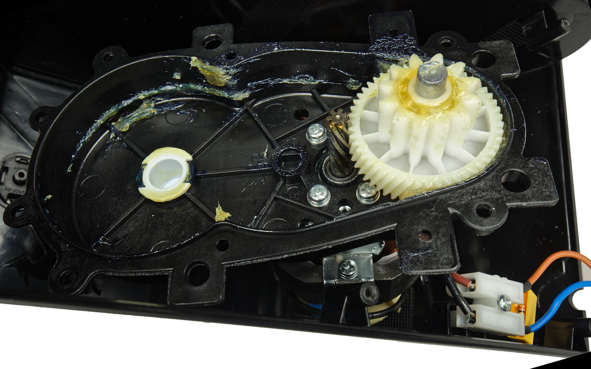 Традиционно мы не ограничиваемся оценкой внешнего вида мясорубки — ее внутренний мир нам тоже интересен. Под пластиковым корпусом расположены моторный блок с редуктором и плата управляющей электроники. Информации о мощности на маркировке мотора мы не обнаружили.