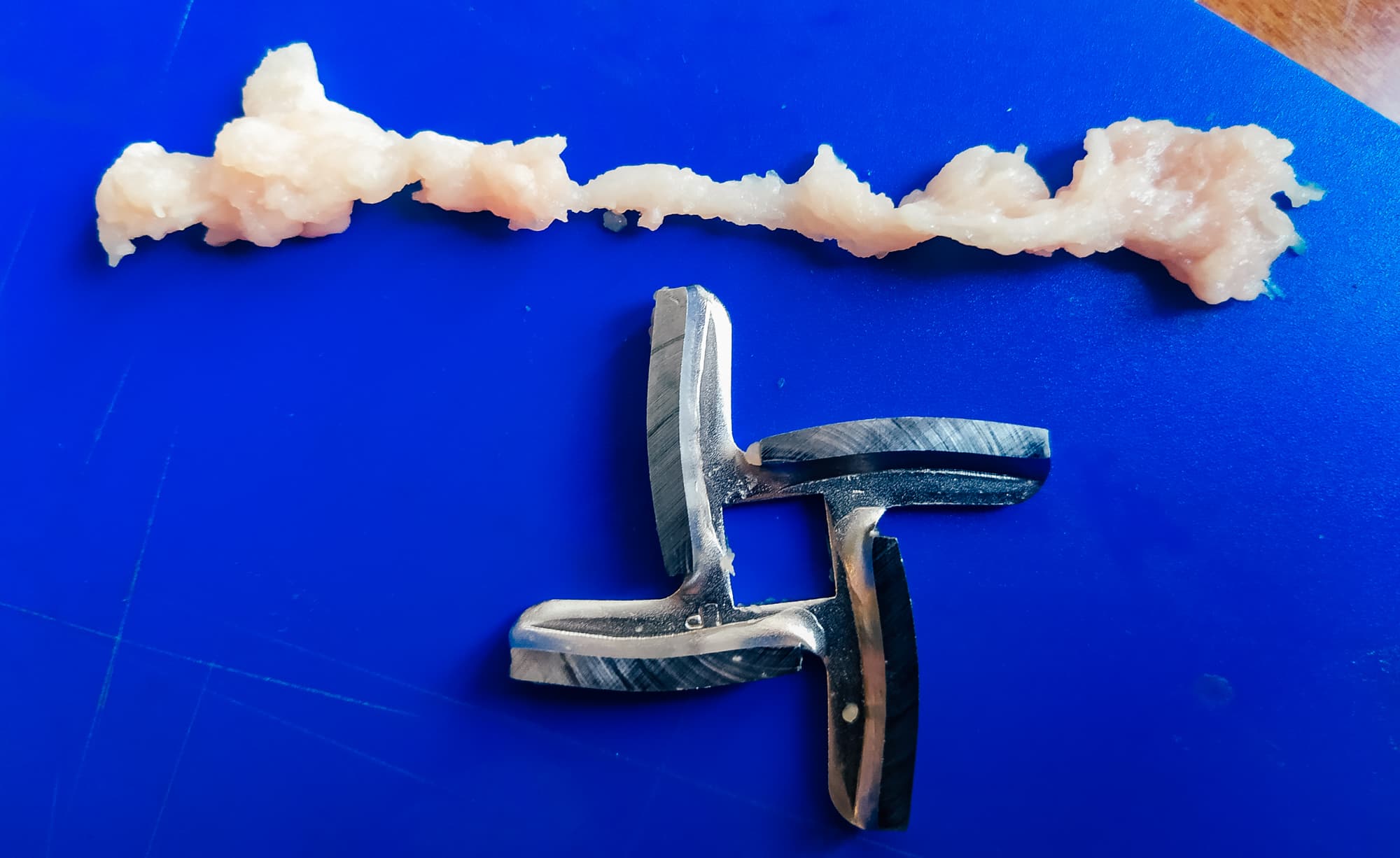 Функция реверса нам не пригодилась, даже жилистое мясо проскочило без проблем. С перегрузками двигателя или нагревом корпуса мы также не столкнулись. За ножом оставался минимум отходов — в основном это были сухожилия.
