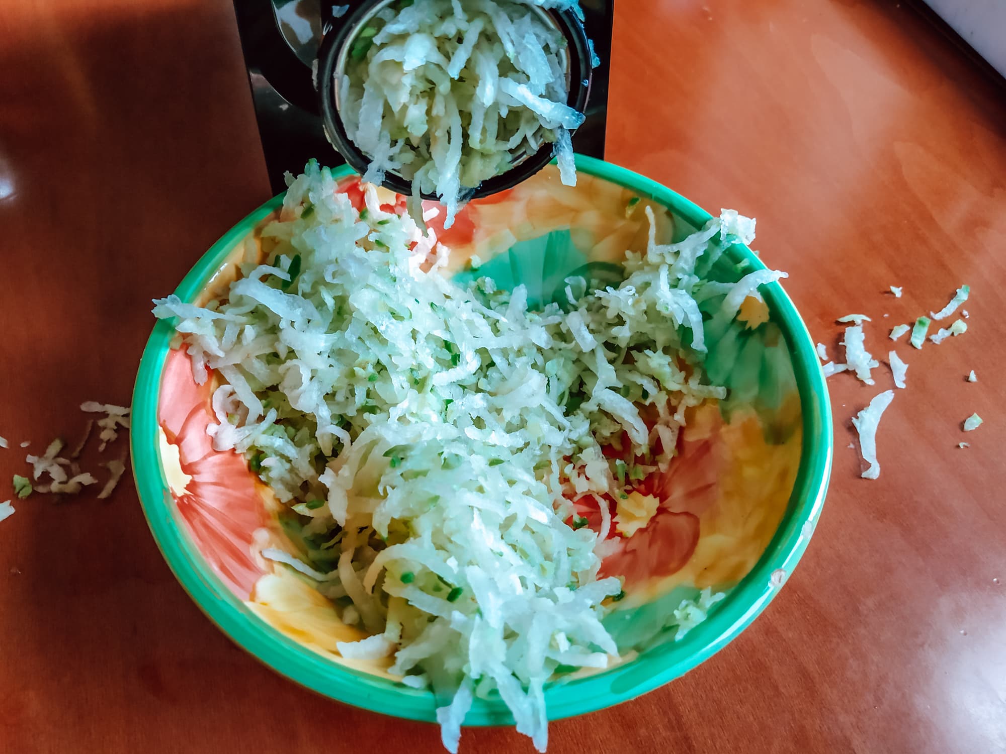 Три небольшие редьки мы нарезали на четвертинки и измельчали в общей сложности где-то полминуты. Приходилось иногда прерываться и вытаскивать из терки утрамбовавшуюся стружку. Но больше нас расстроило то, что измельченная редька разлеталась по бокам от миски и ложилась как по линейке.