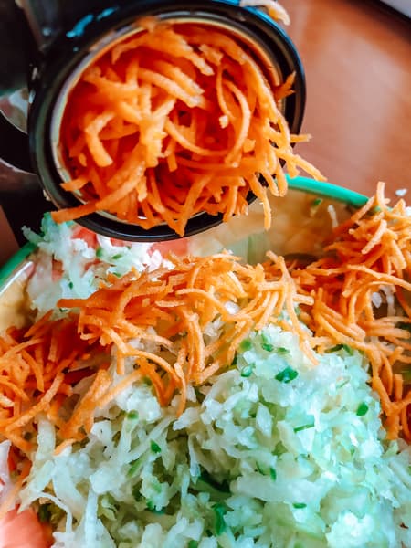 С помощью электрической терки можно за пару десятков секунд приготовить салат, чем мы и займемся.