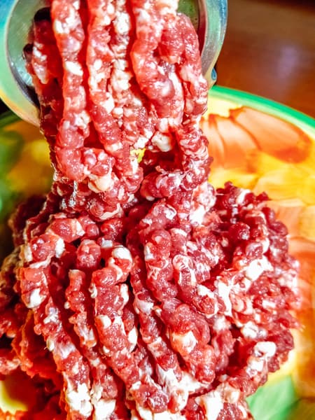 Чтобы проверить мясорубку на прочность, мы взяли говядину с большим содержанием жил. Самые крупные и толстые срезали, но прибору все равно было над чем потрудиться. Использовали решетку крупными отверстиями.