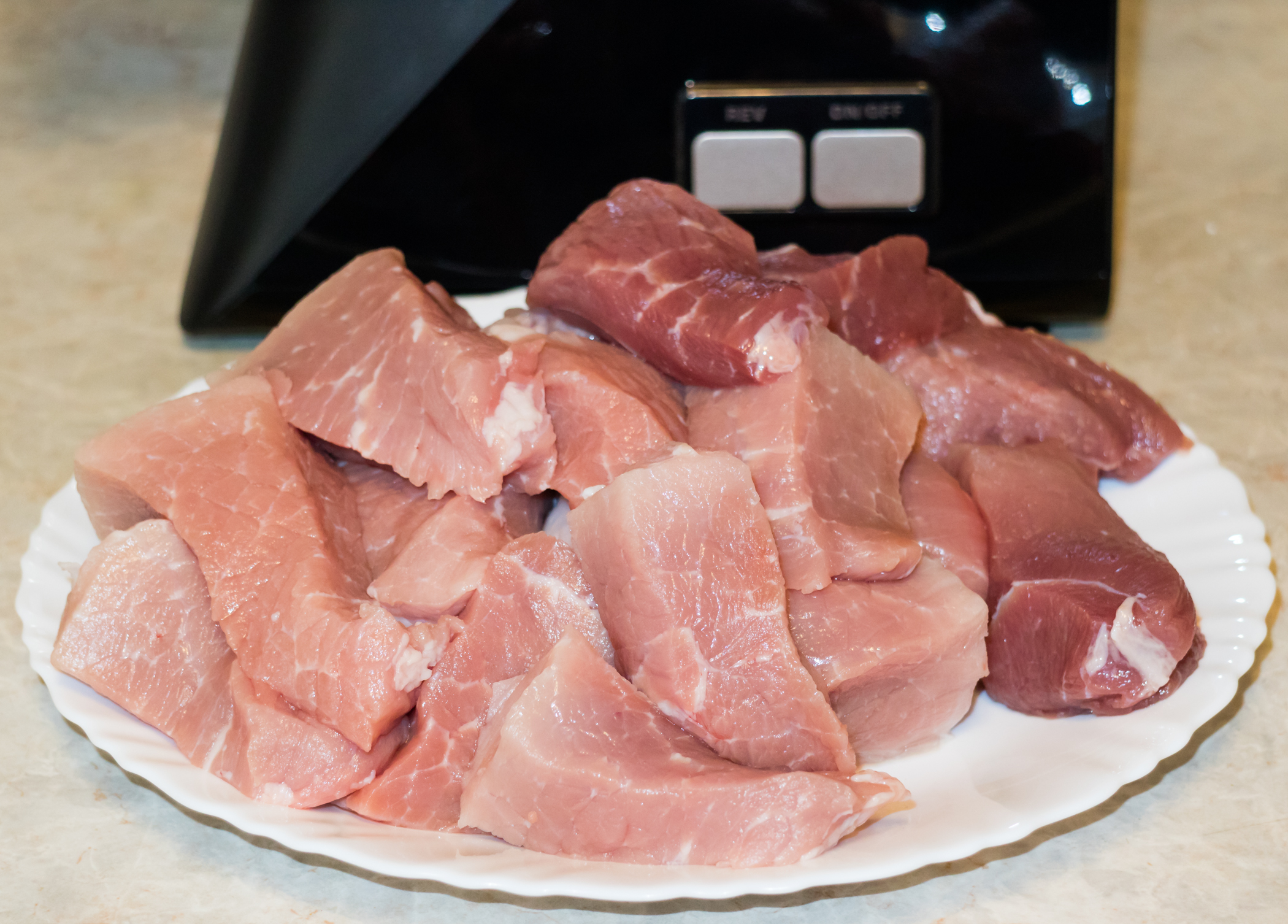 Со свиного окорока удалили жир и жилки, нарезали на кусочки, свободно проходящие в загрузочное отверстие.