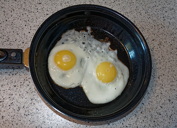 Цель данного теста — проверить, насколько равномерно прогревается сковорода на поднимающемся тэне. Для этого мы зажарили на прилагаемой сковороде два яйца (программа «Жарка»).