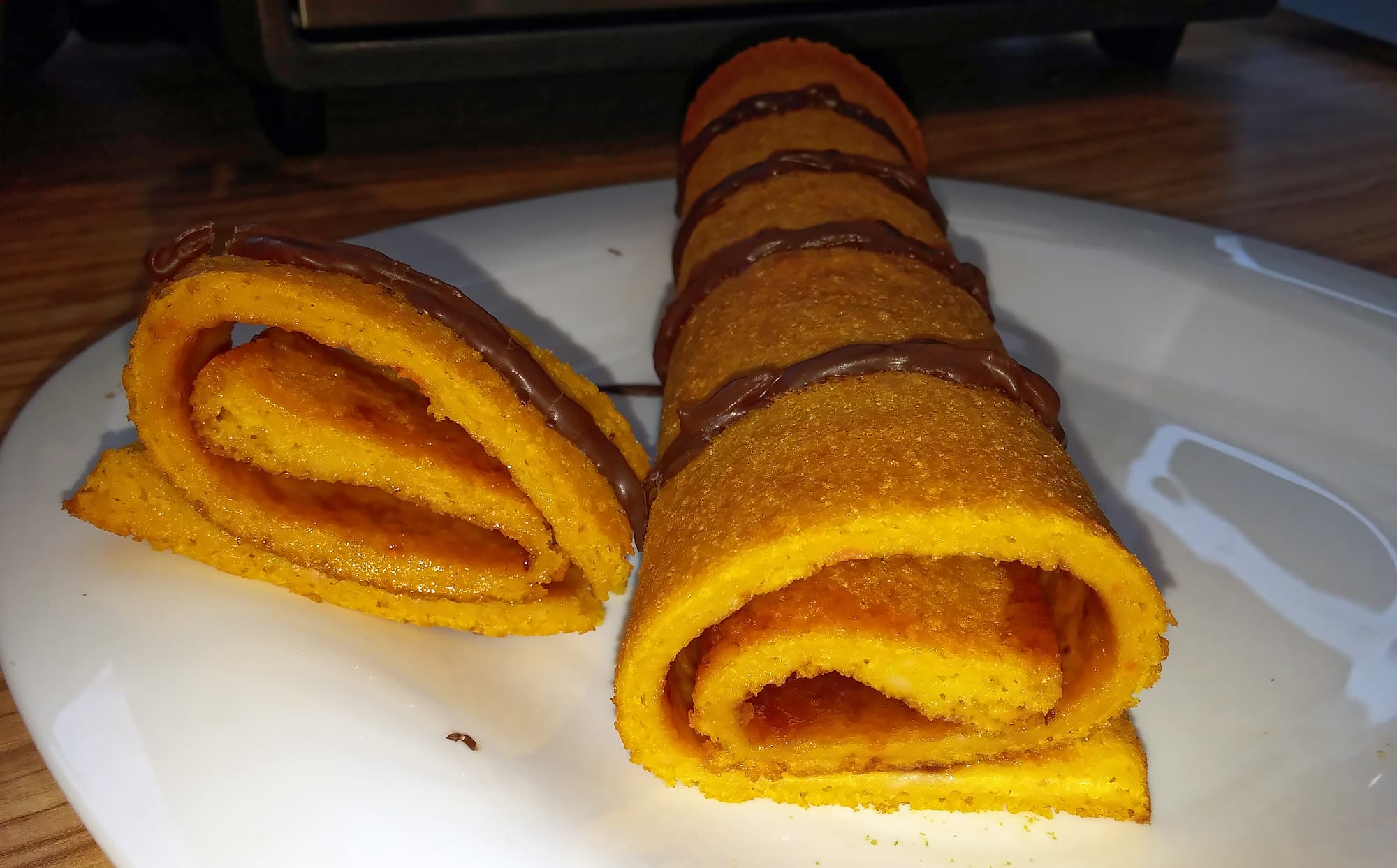 Готовый рулет имеет приятный вкус, который в большей степени зависит от выбранного джема и количества шоколада, чем от коржа. Учитывая популярность морковных тортиков и на редкость приятный аромат самого теста, мы предполагаем, что вместо джема сюда больше подошел бы сметанный или творожный крем. Сразу отметим, что пшеничная мука дает лучшую пластичность, чем кукурузная, поэтому из последней мы не смогли свернуть рулет и приготовили пирог «простейший»: залили тесто вареньем.
