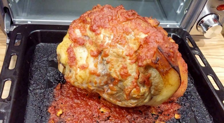 Как мы упомянули выше, рулька весом в 2 кг имела сомнительные шансы на успех в мини-печи, поэтому мы взяли две по 1,2-1,3 кг и немного уменьшили количество остальных ингредиентов. Первое, что удивило нас в рецепте, это порядок действий: сначала смешать томатную пасту с обжаренным чесноком, медом, горчицей и ворчестерским соусом, а потом уже варить рульку. Варили мы ее, как велено, в пиве со специями, луком и морковью целых 2 часа. Далее подготовленный соус нужно смешать с 50 мл бульона, намазать рульку и выложить на противень. Ставить его нужно на нижний уровень, нагрев включать сверху и внизу, выставлять температуру 160 °C и время 45 минут.