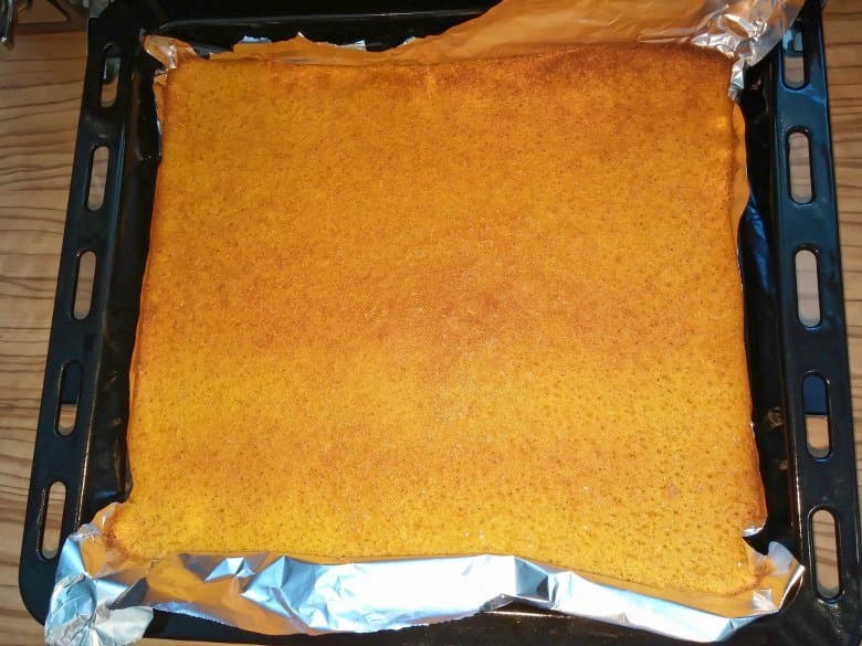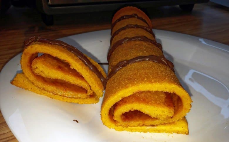 Не сложный, но требующий сноровки рецепт использует 150 г тертой моркови как основу, но мы посчитали более удобным измельчить ее в блендере. Взбив яйцо с сахаром, мы добавили туда 75 г пшеничной муки и морковное пюре, перемешали и вылили тесто на застеленный фольгой противень. Убедившись, что будущий корж лежит ровно, мы поставили противень на средний уровень и включили оба тэна на 180 °C на 20 минут. Затем пришлось проявить терпение и дождаться, когда тесто остынет внутри печи. Мы обнаружили сложность в отделении теста от фольги, поэтому рекомендуем придерживаться рецепта и использовать для выпечки пергамент. Смазав корж джемом, мы свернули его в рулет и немного украсили растопленным шоколадом.