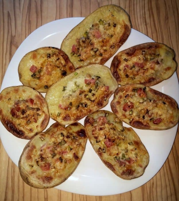 Поскольку нам попался молодой картофель, мы поскребли шкурку и не стали ее счищать. Фаршированную картошку мы разместили на прежнем месте и теперь включили верхний нагревательный элемент уже на 15 минут. Едва закуска немного остыла, мы ее незамедлительно употребили и остались очень довольны.