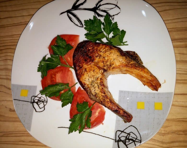 5 стейков семги толщиной 1,5 см мы посыпали специями, полили соком лимона и оставили мариноваться на 2 часа. Однако уже спустя 1,5 часа было решено начать приготовление: мы выложили рыбу на противень и удивились, что все 5 кусков там поместились. Мы включили верхний тэн на максимальную температуру, подождали 5 минут, установили противень на верхний уровень печи и спустя 30 минут получили готовую рыбу.