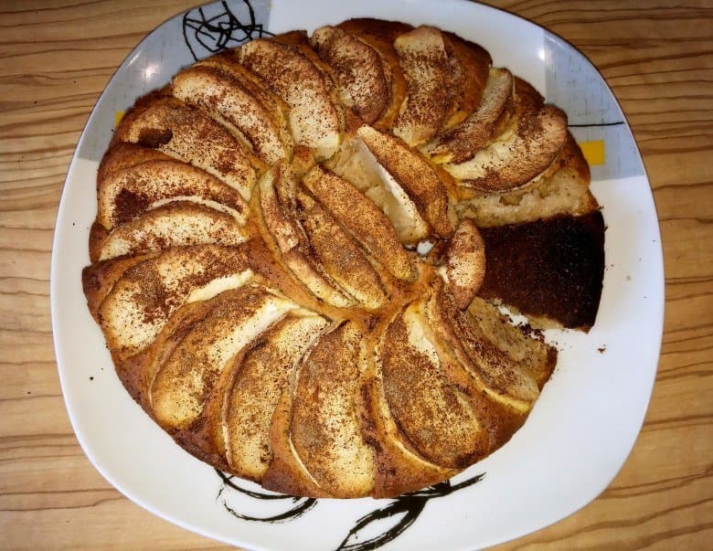 Открытая вариация «шарлотки» предполагает простое тесто на основе взбитого с сахаром яйца, 200 г пшеничной муки, 125 мл йогурта (мы использовали ряженку), топленого масла, разрыхлителя и ванилина. Мы поэкспериментировали с полбяной мукой (подойдет избегающим глютена) и получили более густое тесто, поэтому не вылили, а скорее выложили его в форму, украсив сверху кругами из яблочных долек и щепоткой корицы. Форму положили на решетку на нижнем уровне, включили верхний и нижний тэны на 180 °C на 1 час и получили симпатичный пирог с подгоревшей снизу корочкой.