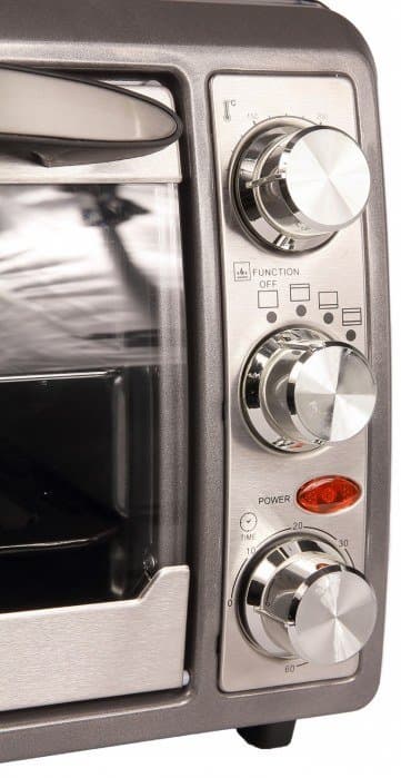Мини-печь действительно небольшая, размером со стандартную микроволновку. Массивная ручка во всю длину дверцы и крупные, сверкающие хромом механические регуляторы создают впечатление чего-то основательного, которое длится до первого перемещения устройства — ибо вес в 5 кг кажется непропорционального малым. В целом печь выглядит нейтрально и может вписаться в любую кухню.