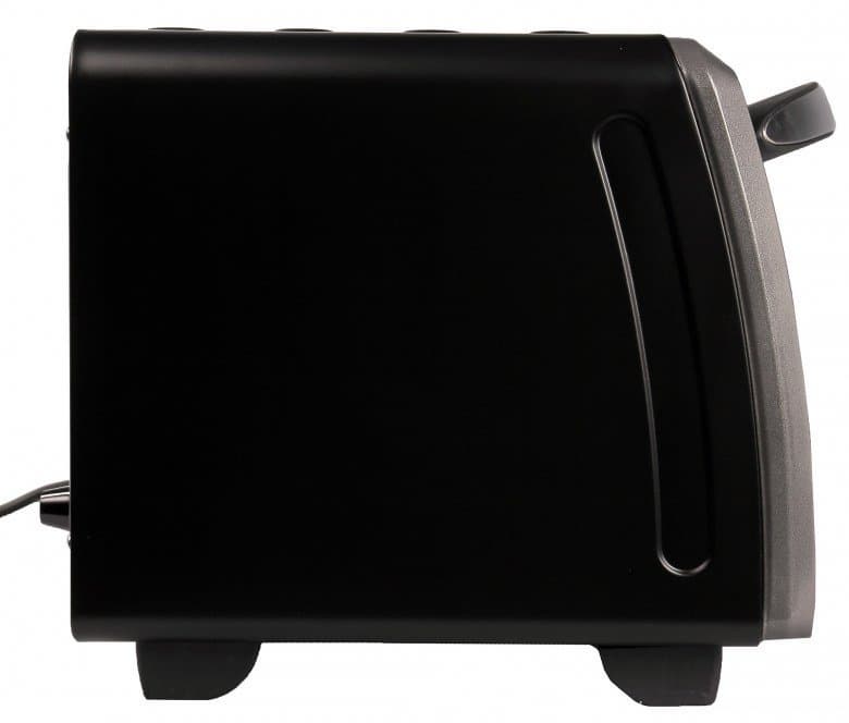 Передняя панель из графитового пластика украшена серебристыми стальными накладками, остальные поверхности выполнены из матового черного пластика, с объемными полосами на верхней стороне. Три круглых поворотных регулятора отвечают за температуру, режим и продолжительность нагрева. С началом работы загорается оранжевая лампочка с подписью Power.
