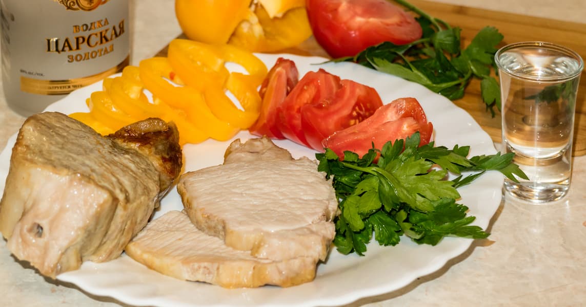 Буженину готовили традиционным способом. Свиную шею нашпиговали зубчиками чеснока и обмазали смесью растительного масла со специями и солью. Завернули в фольгу и уложили на противень.