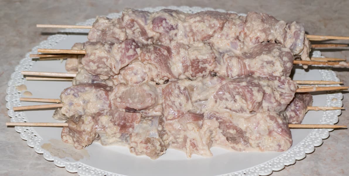 Замариновали на сутки кусочки бедра индейки в смеси кефира, блендированного лука и специй. Затем нанизали мясо на деревянные шпажки.