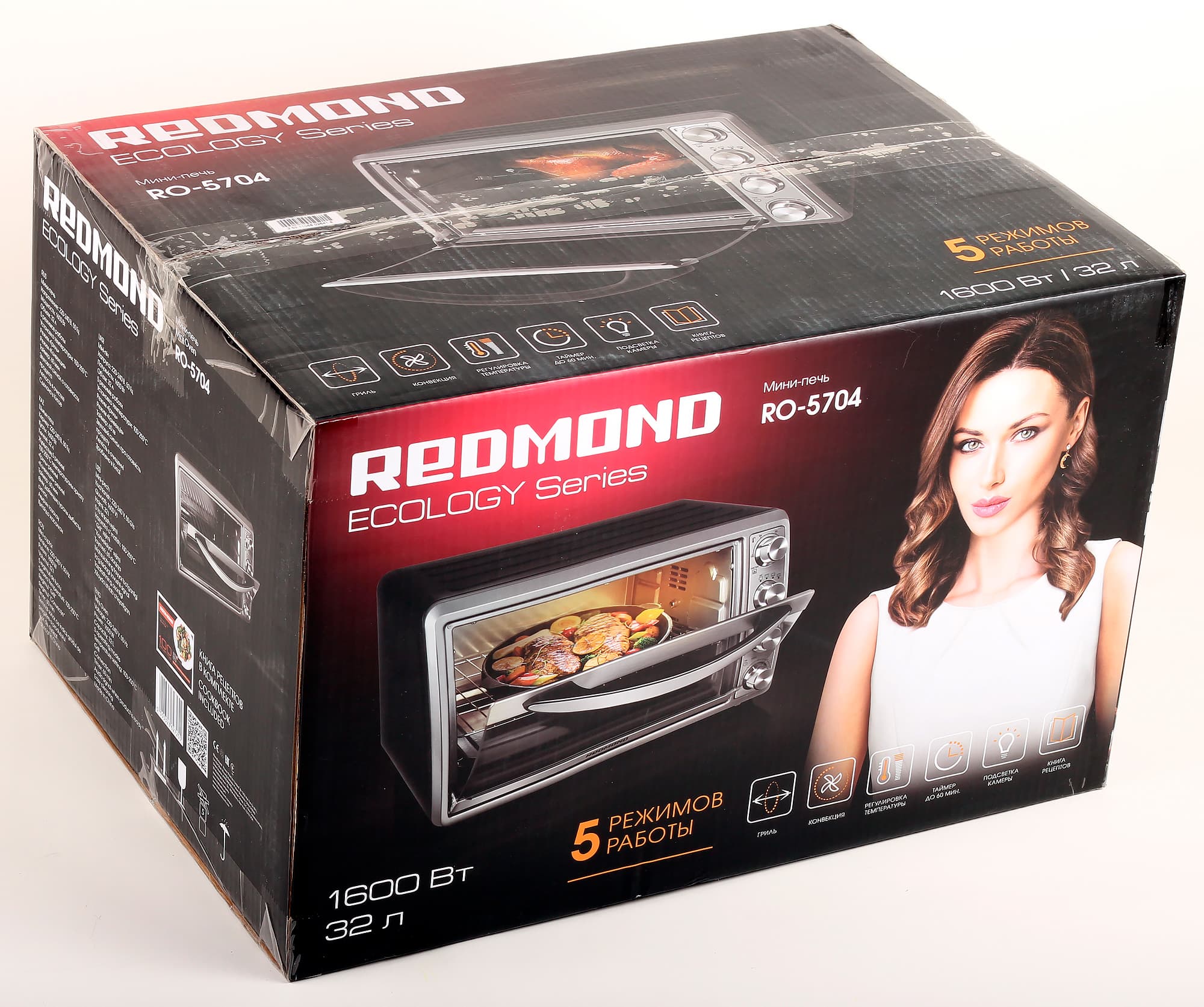 Мини-печь прибыла в тестовую лабораторию iXBT.com в большой по размерам картонной коробке-параллелепипеде. Коробка оформлена в черном и градуированном бордовом цветах. Информации, что типично для Redmond, на упаковке размещено много: изображение устройства, фотография симпатичной барышни, перечень всех функций и описание технических характеристик. Внимательно изучив коробку, пользователь получит полное представление о духовке, находящейся внутри. Ручки для переноски нет, что неудивительно при таком внушительном весе.