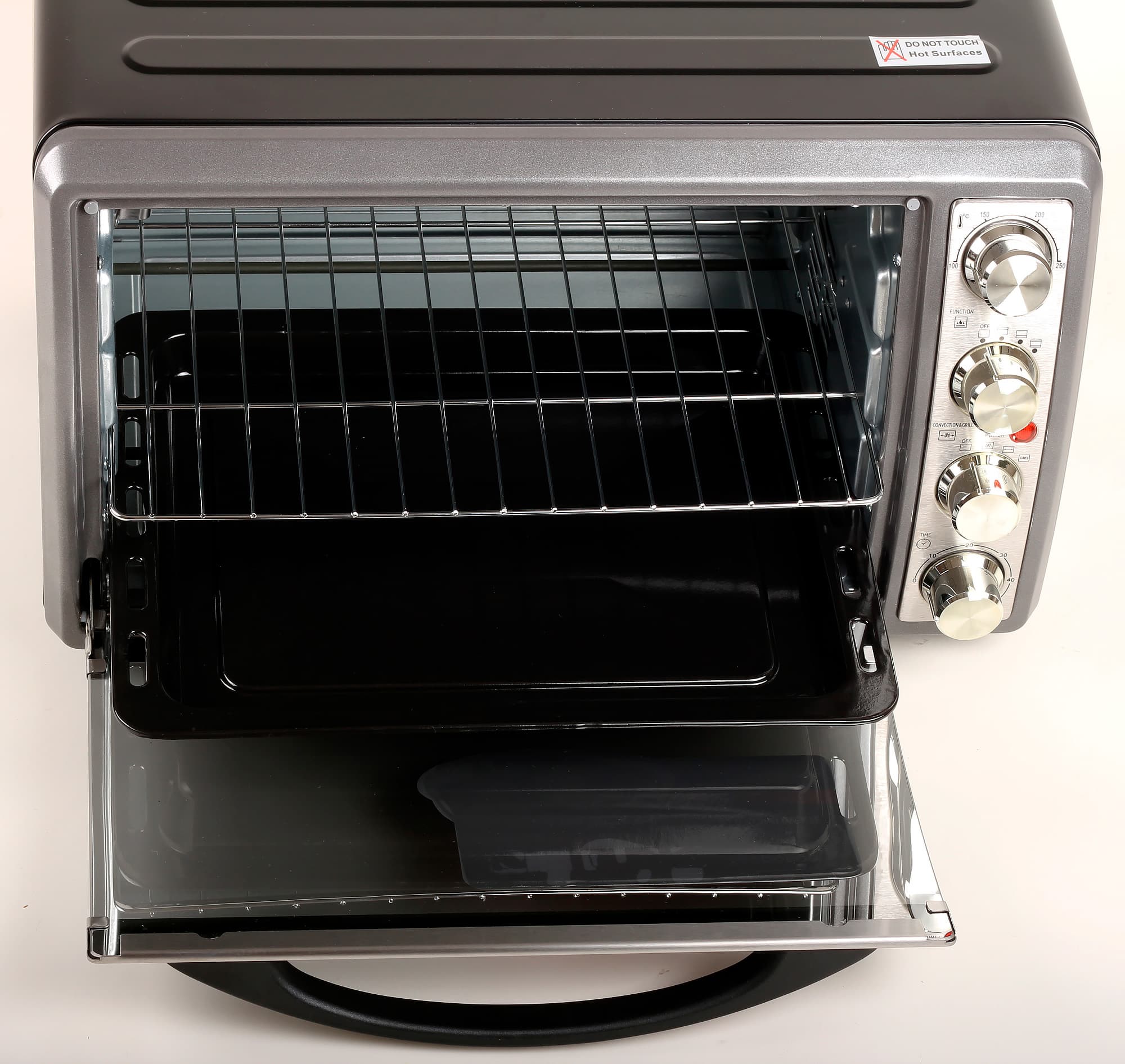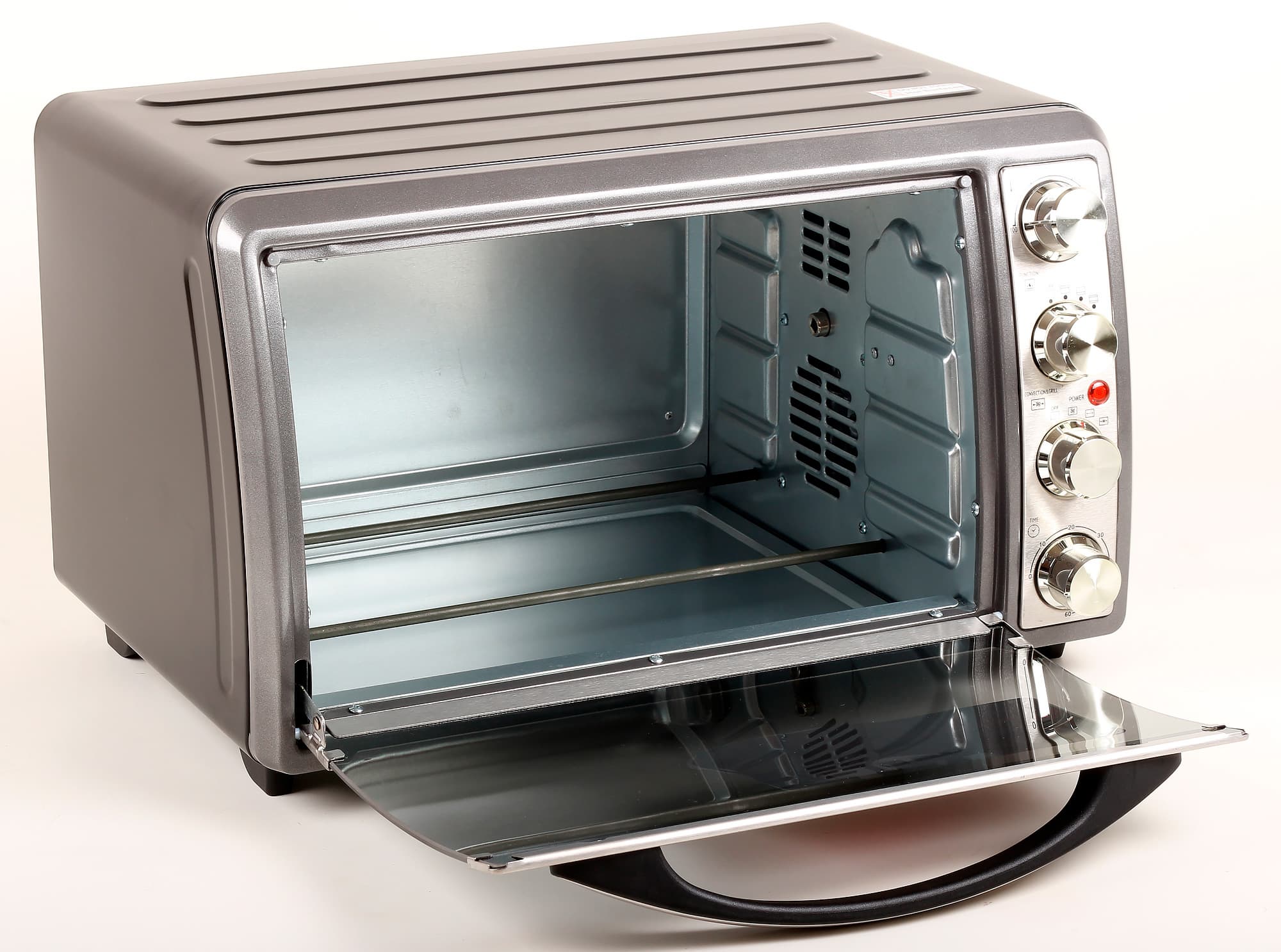 На первый взгляд мини-духовка не такая уж и мини. Внутренняя камера в 32 литра позволит приготовить нормальные порции блюд и запечь мясной пирог внушительного размера. Корпус сделан из окрашенного в черный цвет металла. Лицевая часть выделена темно-серым цветом. Благородной нержавейкой сверкает панель управления с регуляторами и конструктивные элементы стеклянной дверцы. Металл хорошо обработан, качественно и равномерно окрашен, все стыки и соединения деталей гладкие и аккуратные. На правой боковой стороне корпуса видны несколько рядов вентиляционных отверстий.