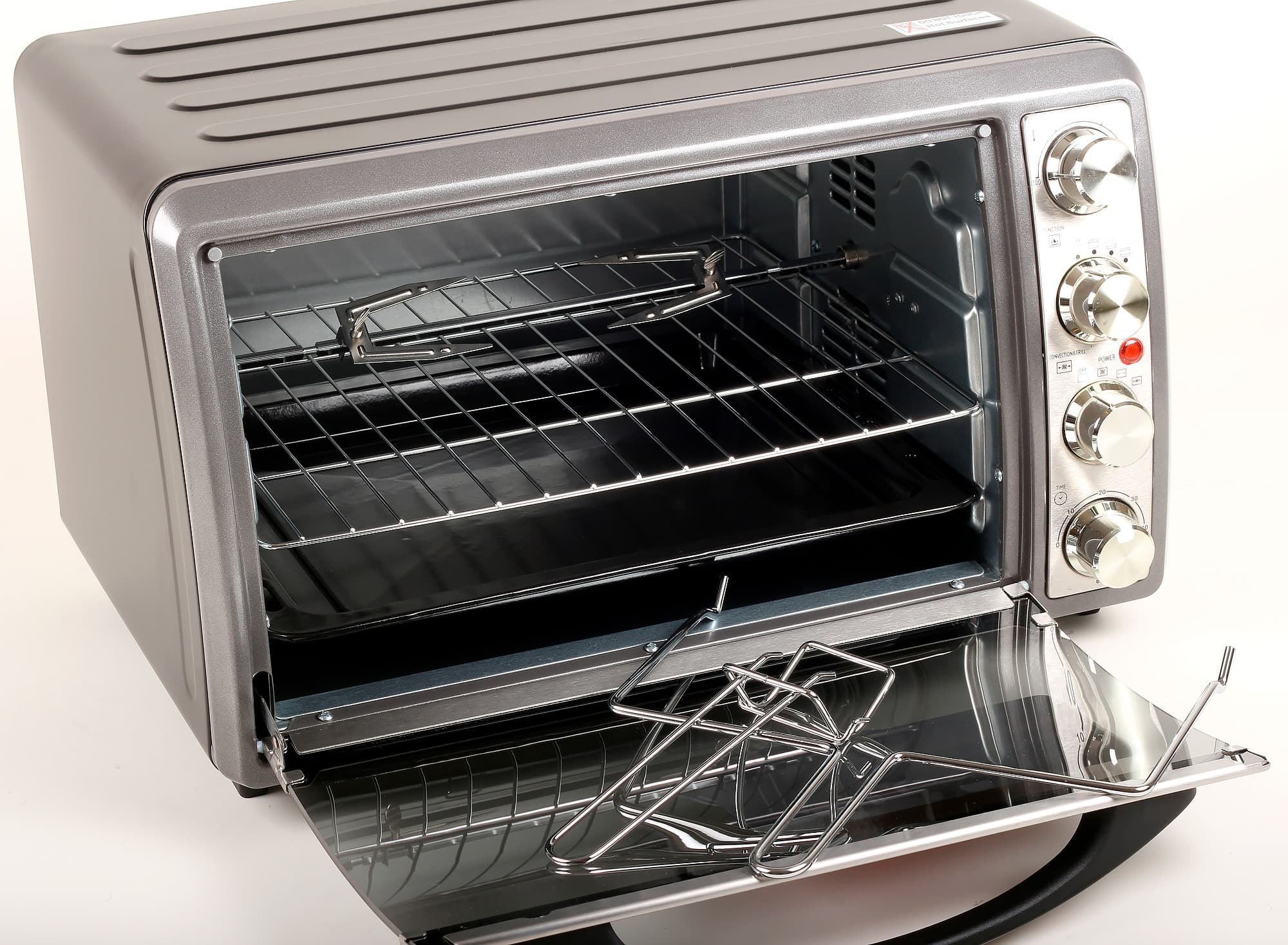 - Под ручкой выбора режима работы находится регулятор режима приготовления «Convection&Grill». Печь позволяет готовить с обдувом, на вертеле и на вертеле с обдувом.