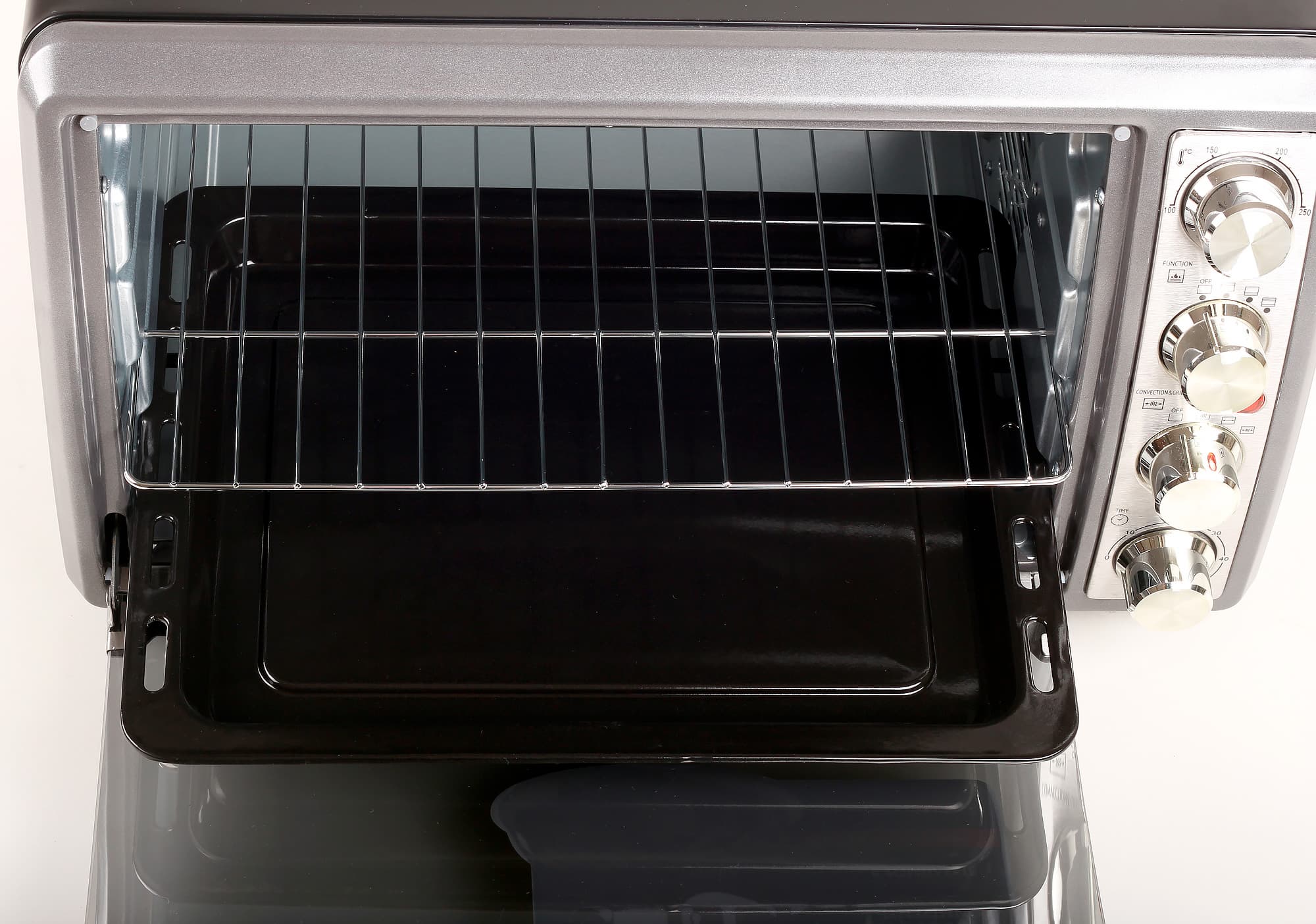 Теперь заглянем внутрь мини-печи. Рабочая камера вполне стандартна: на боковых стенках выделены три ряда направляющих для установки решетки или противня, сверху и снизу закреплены по паре тэнов. Противень и решетку можно установить на среднем уровне, ближе к верхним или к нижним нагревательным элементам. На дне внутренней камеры размещается поддон для сбора крошек и частичек пищи. Поддон рекомендуется использовать при приготовлении блюд на решетке, чтобы на нижние нагревательные элементы не попадали брызги мясного сока или кипящего жира. В этом случае он устанавливается таким образом, чтобы оказаться между решеткой и нижними тэнами.