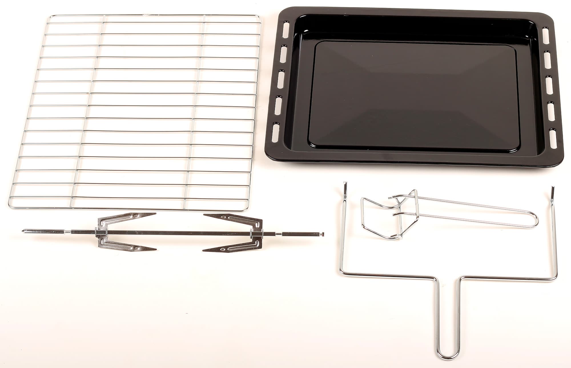 Все аксессуары — противень, решетка, вертел и ручки к ним — имеют классическую форму и исполнение. Визуальный осмотр не выявил каких-либо особенностей или недостатков.