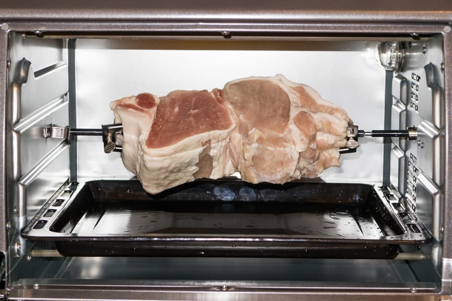 Из предыдущих опытов мы знаем, что влаги выделяться будет много, объема поддона может не хватить, потому подставили под вертел противень, застеленный фольгой. Установили таймер на 60 минут, температуру на 200 °C, включили нагрев обоих тэнов.