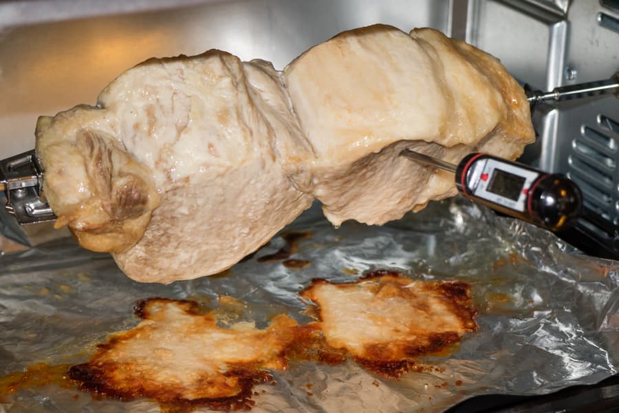 Добавили еще 20 минут, включили конвекцию и увеличили температуру до 220 °C. Однако поверхность мяса все равно осталась недостаточно поджаренной. В завершение установили максимальные 250 °C на 25 минут.