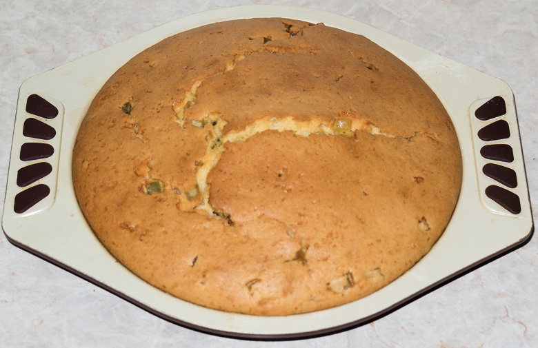 Этот простой кекс мы решили приготовить, чтобы удостовериться в равномерности нагрева тэнов. Поверхность пирога с сыром нам показалась прожаренной с разной степенью интенсивности. Параллельно оценим, как ведет себя духовка при выпечке высоких пирогов или бисквитов, не сгорит ли, когда изделие увеличится в объеме, его верхушка.