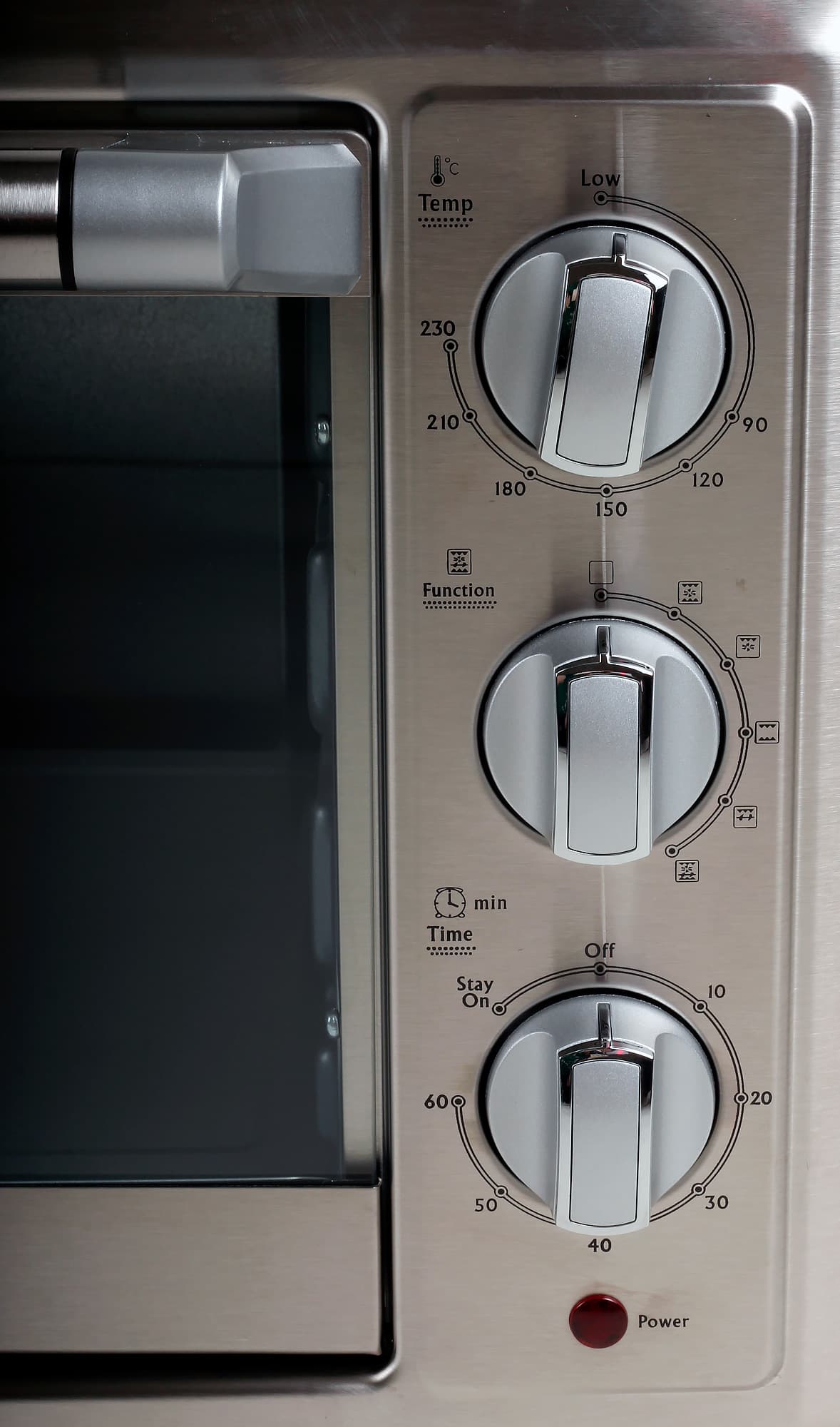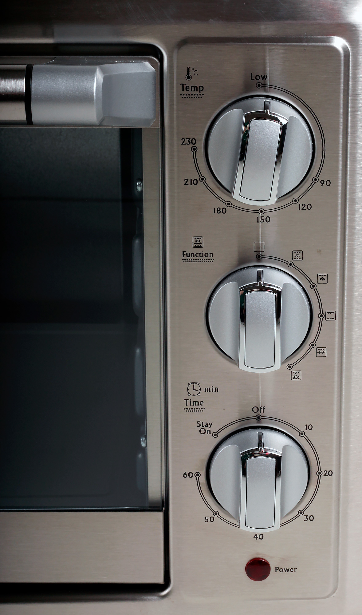 На панели управления мини-печью находятся три механические вращающиеся рукоятки, с помощью которых можно задавать режим, температуру и время приготовления пищи. Верхняя отвечает за температуру: выбор от 90 до 230 градусов (можно меньше, как показала практика) с нумерованным шагом в 30 градусов. Температуру от 180 до 210 °C, например, надо задавать приблизительно, деля шкалу между двумя значениями на три части или шесть, в зависимости от нужной точности.