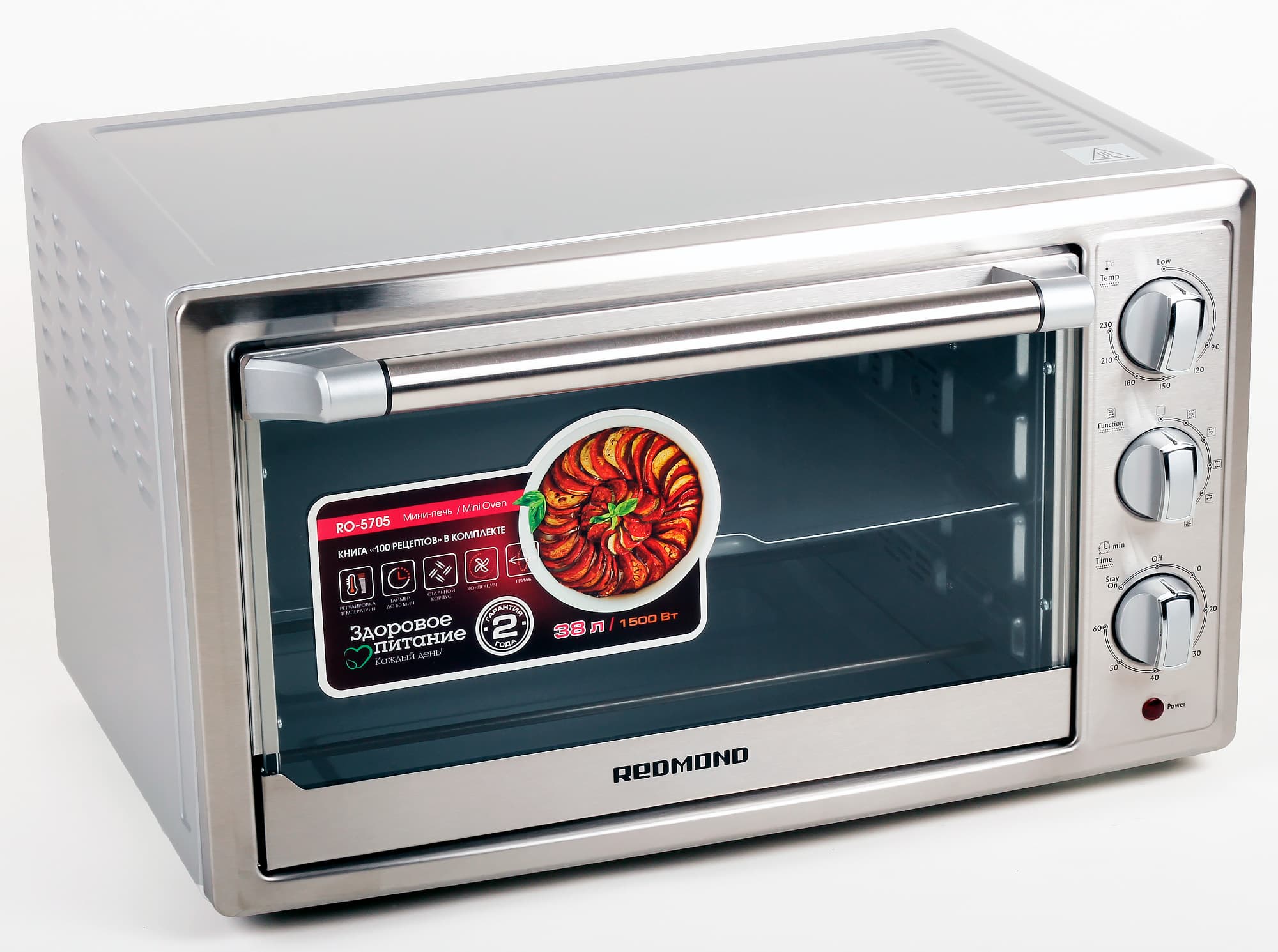 Кроме того, здесь же перечислены основные достоинства печи с точки зрения производителя: таймер до 60 минут, регулировка температуры, конвекция, гриль, стальной корпус и книга рецептов. Та же информация дублируется на передней и задней стенках коробки.