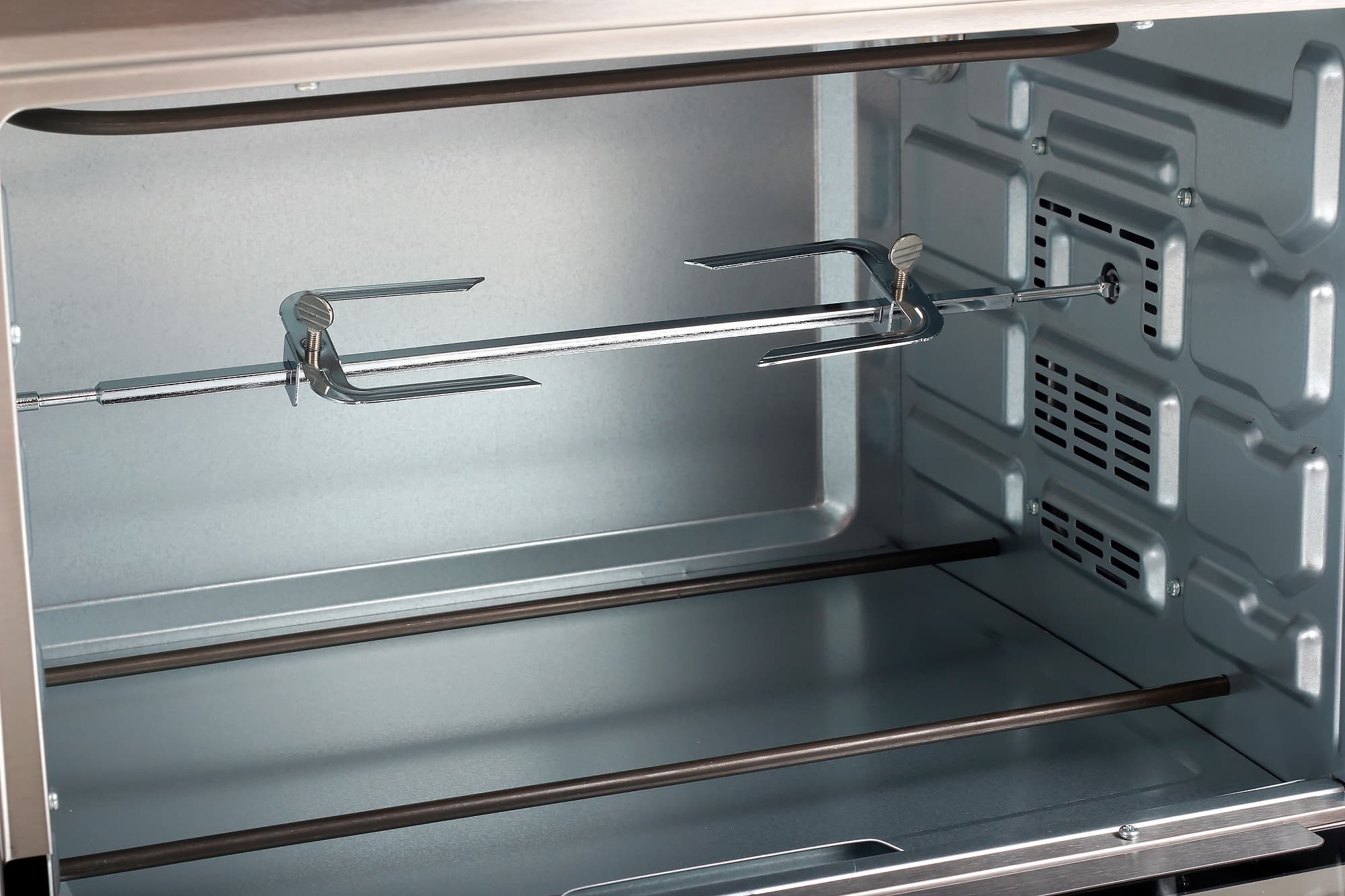 Нижние тэны (нагревательные элементы) прямые — их два, у дверцы и у задней стенки. Верхний — изогнутый по всей поверхности духовки.