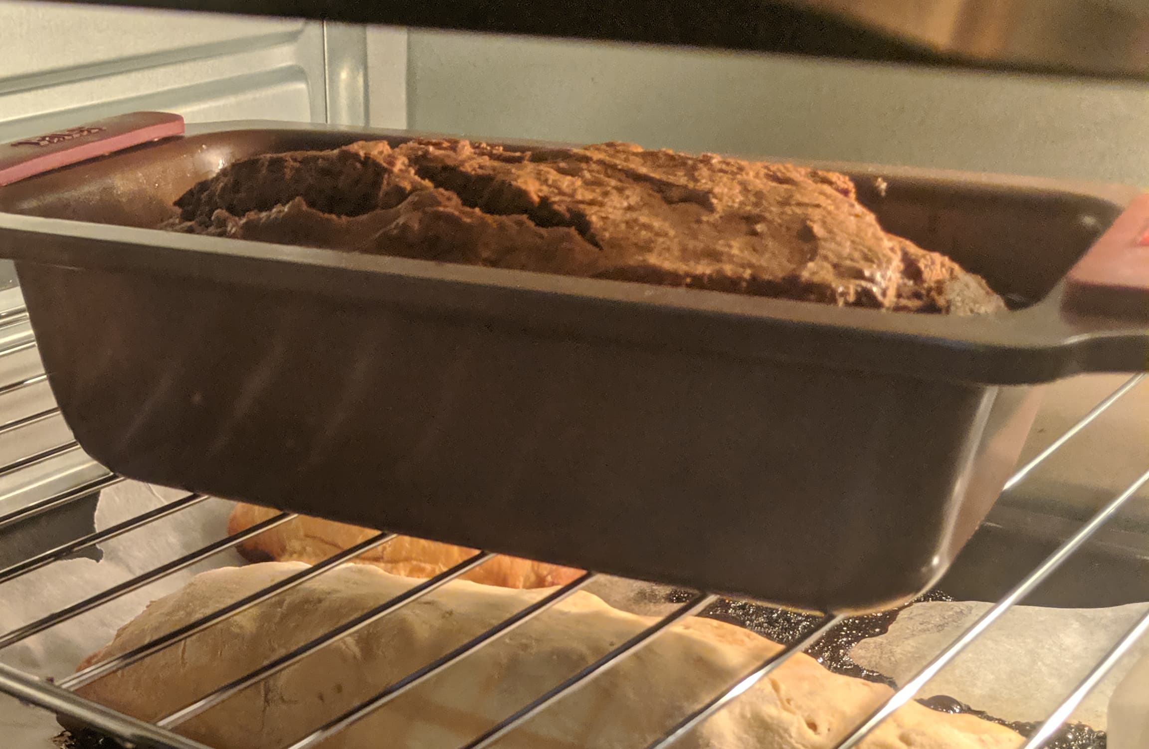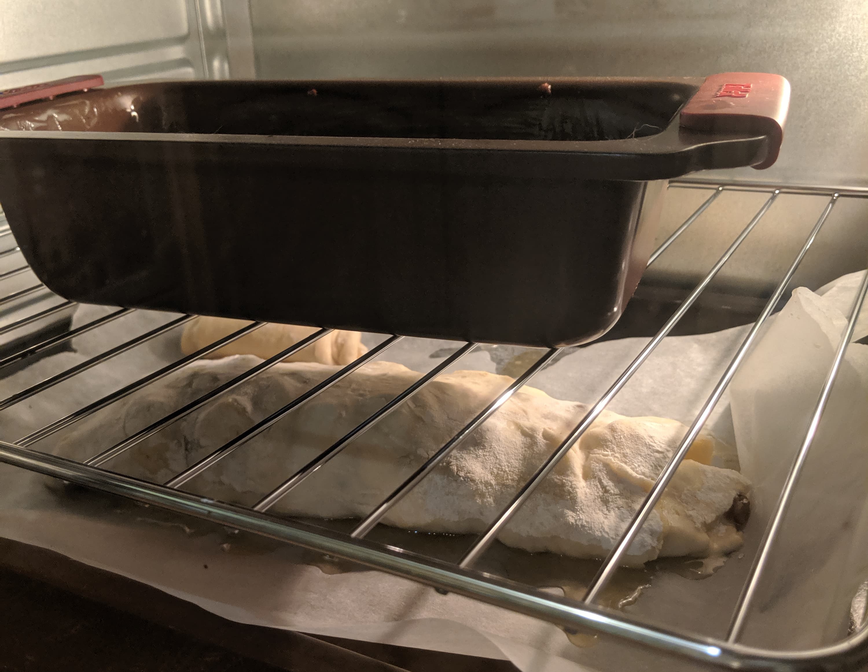 Пока тесто вымешивалось в последний и решительный раз, духовка, поставленная нагреваться на 230 градусах в режиме «верхний нагрев, нижний нагрев и конвекция», прогрелась до приблизительно расчетной температуры (около 179 °C — и заняло это 7 минут).