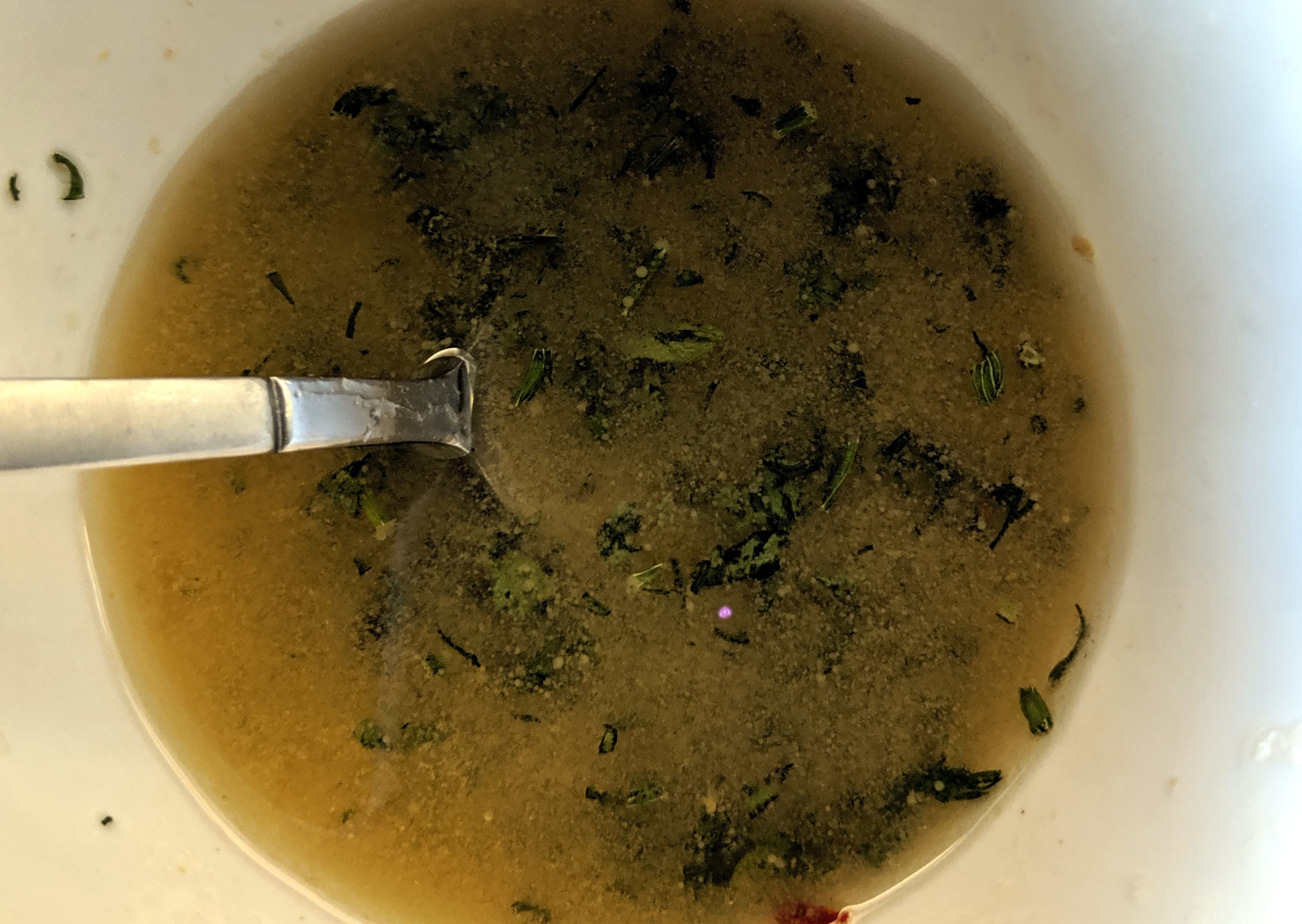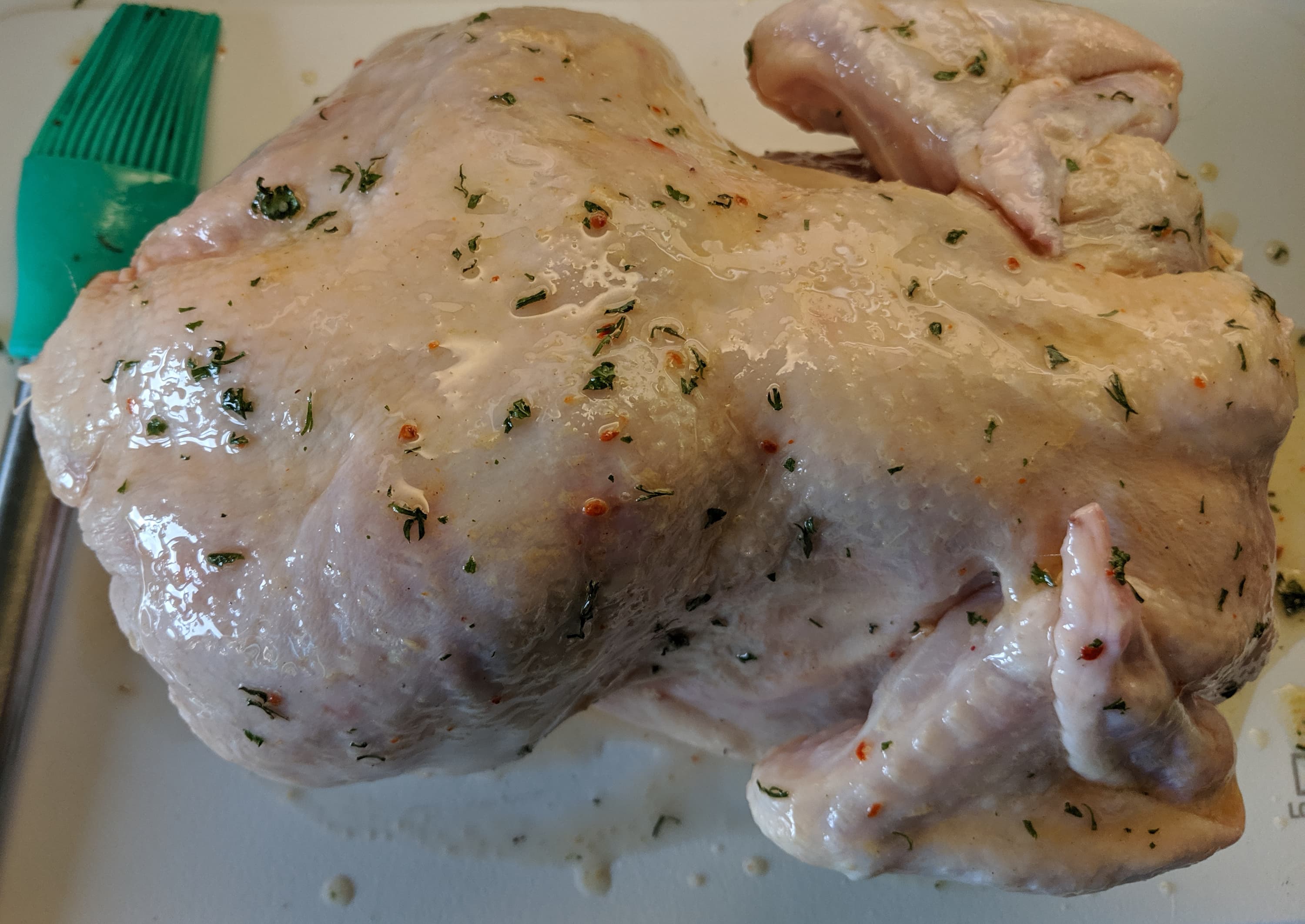 В растительное масло положили сушеную (можно и свежую) зелень, красный турецкий перец (можно черный молотый), соль, сок половины лимона и немного горчицы. Взбили кисточкой и дали настояться в течение 10 минут. Затем той же кисточкой обмазали полуторакилограммовую куриную тушку и оставили полежать на полчасика.