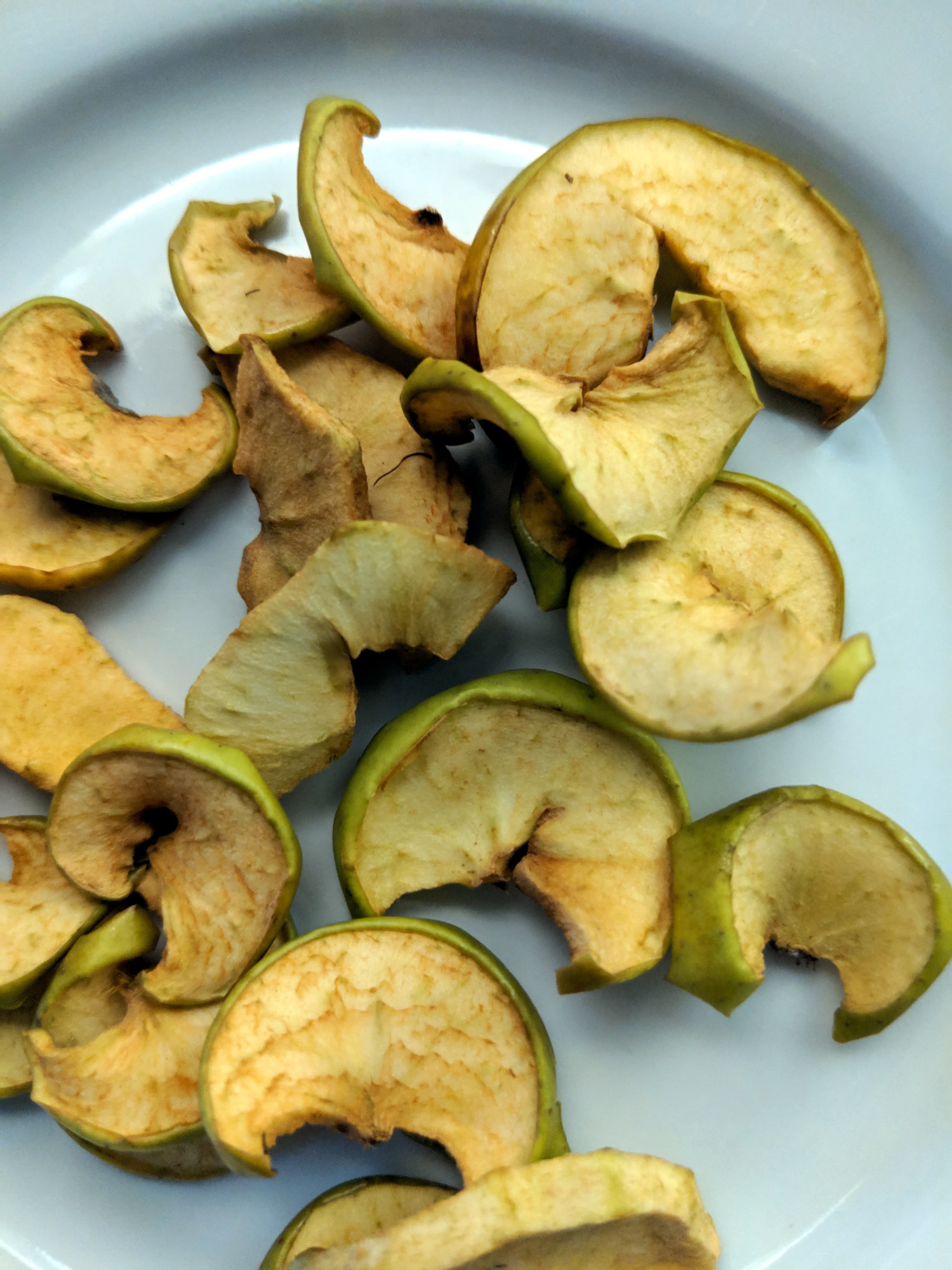 Нарезанные ломтиками яблоки (в кожуре и без) мы положили на пергамент, разместили листы на решетке и на поддоне и включили на минимальную температуру в режиме без таймера. Через семь часов и 0,75 кВт·ч потраченной энергии у нас получилась мисочка сушеных яблок прекрасного качества. Правда, некоторые куски можно было еще посушить, но придираться к результату не стали.