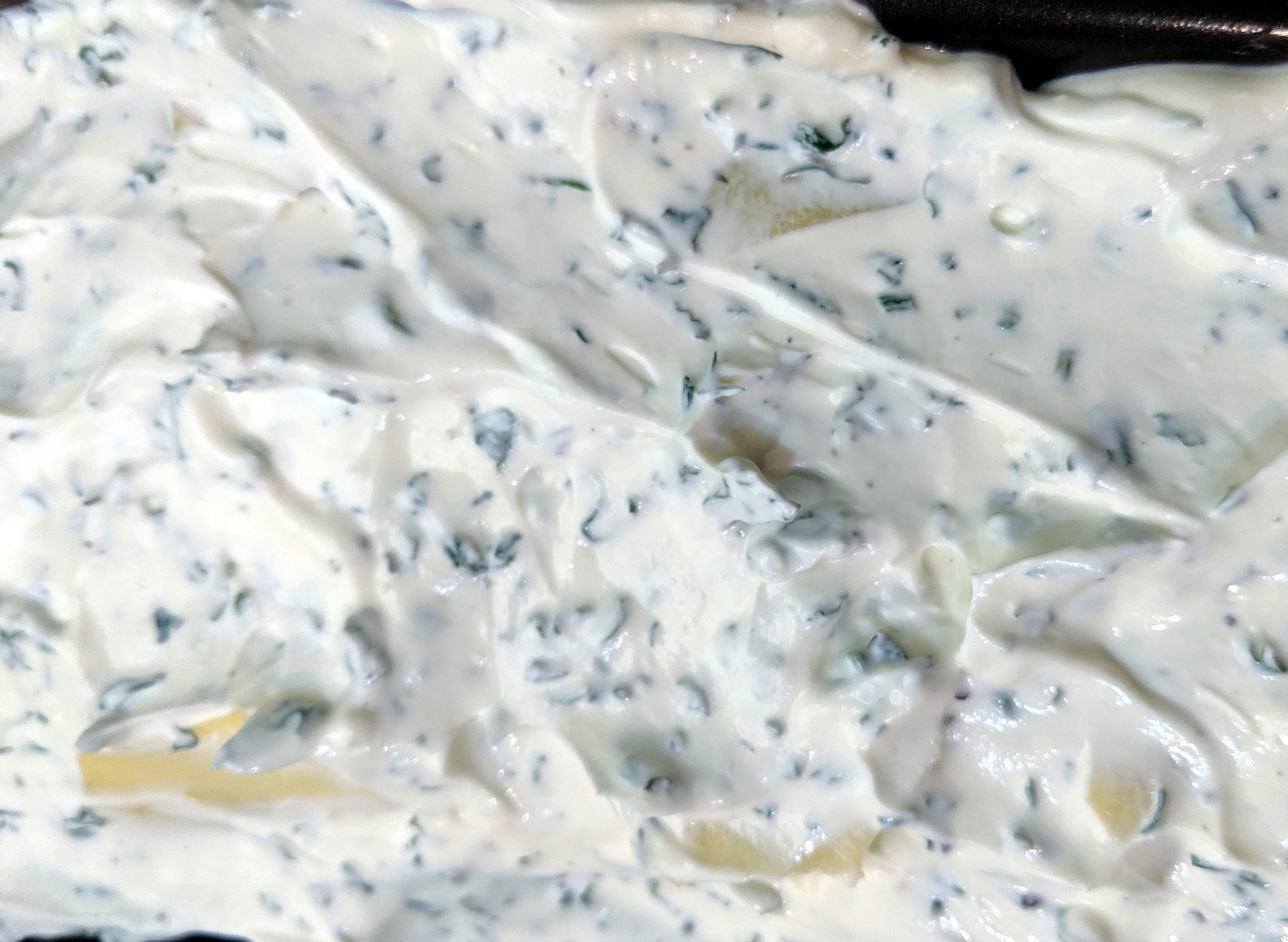 В смазанную маслом форму мы положили слоями нарезанные тонкими кружочками картофель, морковь, лук. На овощную подушку уложили средней величины куски куриного филе, прикрыли еще одним слоем картофеля. Сверху щедро смазали сметаной с оливковым маслом и сушеной зеленью и посыпали тертым сыром.