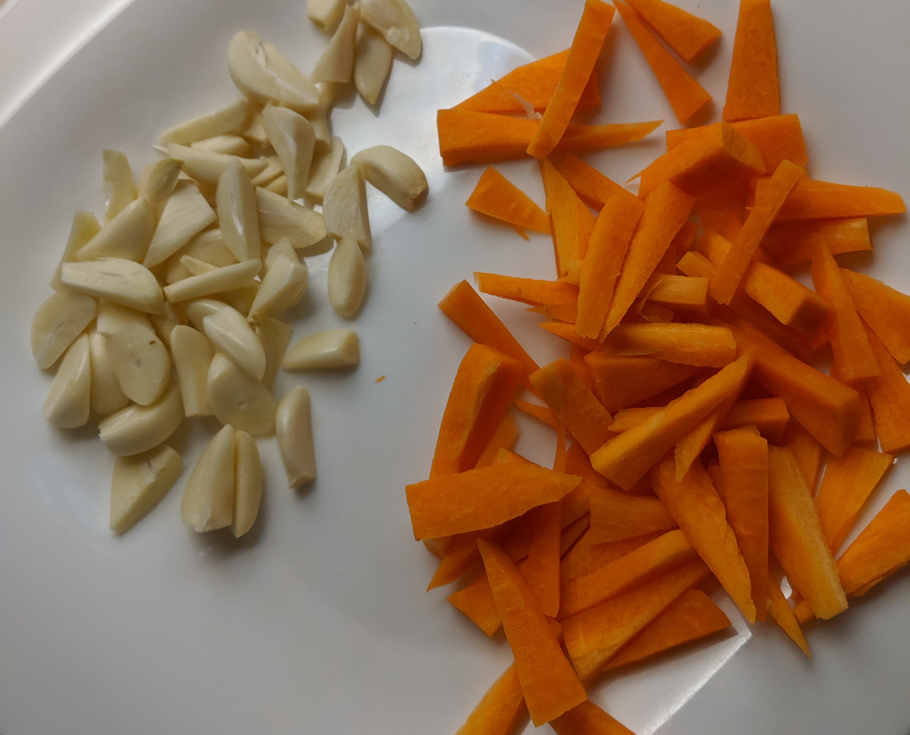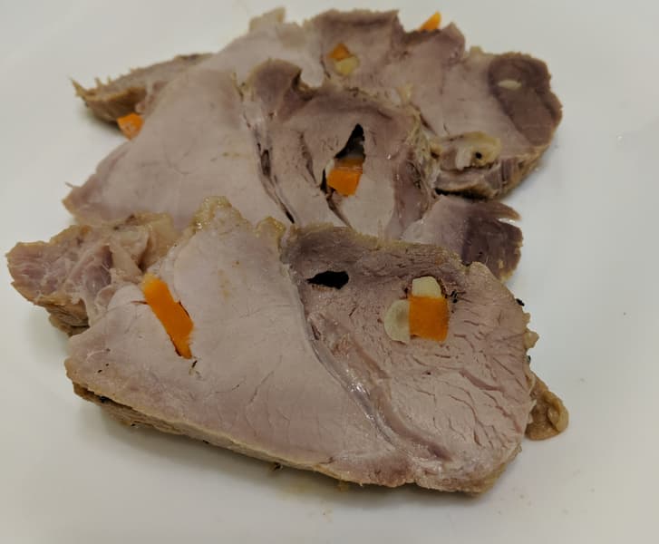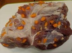 Разумеется, нельзя взять на тестирование мини-печь и не запечь в ней мясо. Мы взяли хороший кусок свинины весом полтора килограмма, нежирный. Нашпиговали его чесноком и морковью. В рецепте допускается вариации с черносливом, но мы решили не усложнять.