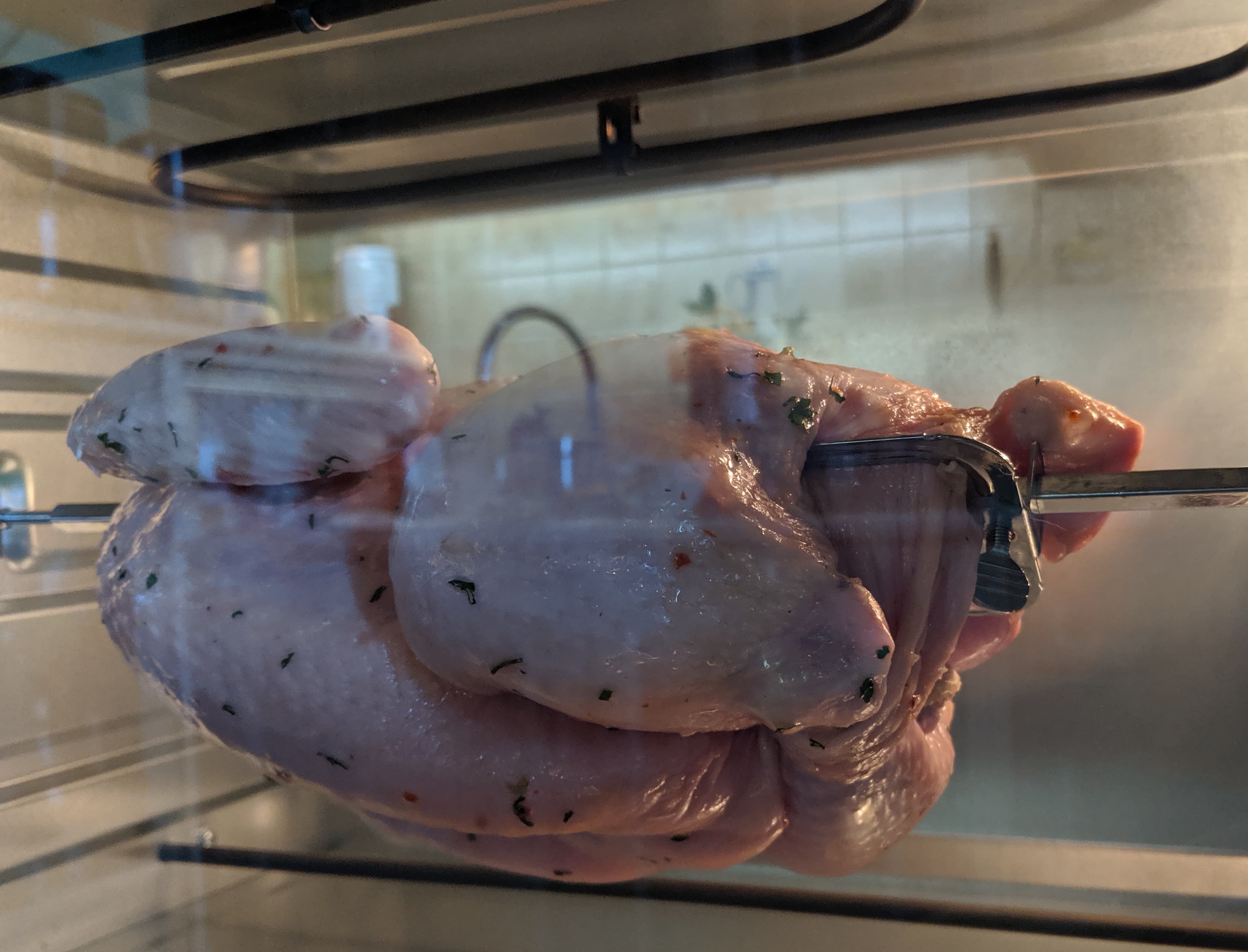 Насадили курицу на вертел, как указано в инструкции, закрепили двумя рогатинами и отправили в печь на 60 минут при температуре 220 градусов. Режим — «верхний нагрев + режим гриля». Напомним, что вращение вертела происходит только в тех режимах, в которых есть гриль.